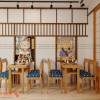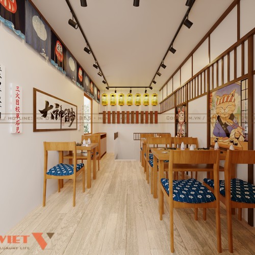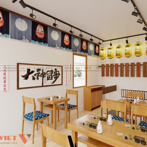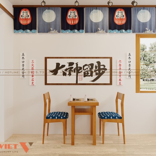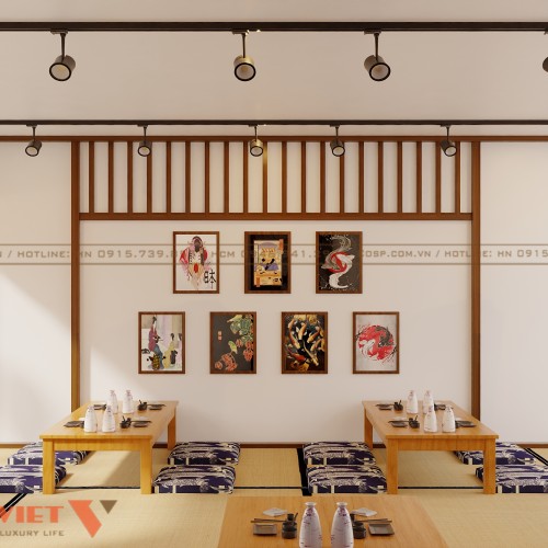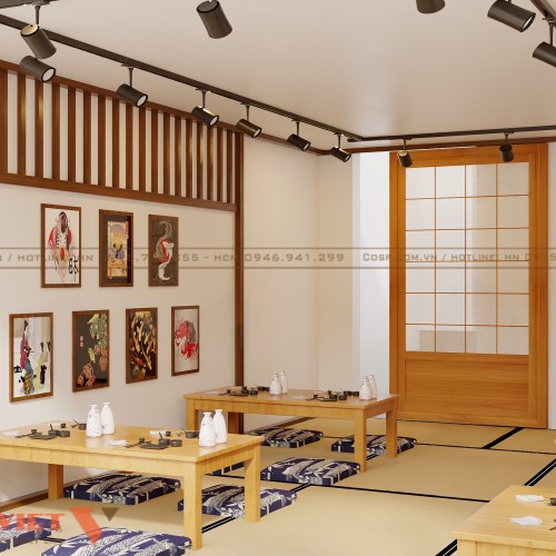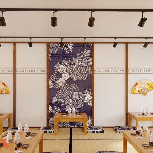 Tường được sơn trắng kết hợp với các mảng gỗ ốp tạo sự cân bằng giữa hiện đại và truyền thống. Trần nhà sử dụng hệ thống đèn rọi chiếu sáng và tăng tính thẩm mỹ cho không gian. Các chi tiết trang trí như quạt treo, tranh treo tường họa tiết Nhật Bản, rèm noren treo ở cửa sổ là điểm nhấn nổi bật, giúp truyền tải tinh thần văn hóa của xứ sở hoa anh đào.