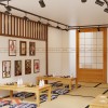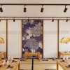 Sử dụng đệm vải có hoa văn truyền thống Nhật Bản. Đệm ngồi vừa mang tính thẩm mỹ và đem lại sự thoải mái cho thực khách. Tường khu vực này được trang trí bằng các quạt giấy lớn, kết hợp với rèm noren treo ngang ở cửa sổ để tạo không gian vừa riêng tư vừa thoáng đãng.