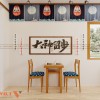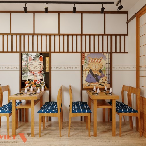 Hệ thống đèn rọi tập trung ánh sáng xuống bàn ăn để làm nổi bật thực đơn tăng trải nghiệm và sự hấp dẫn cho khách hàng. Một phần tường được trang trí bằng tranh in khung kính mang hình ảnh mèo thần tài hay biểu tượng văn hóa Nhật Bản khác.