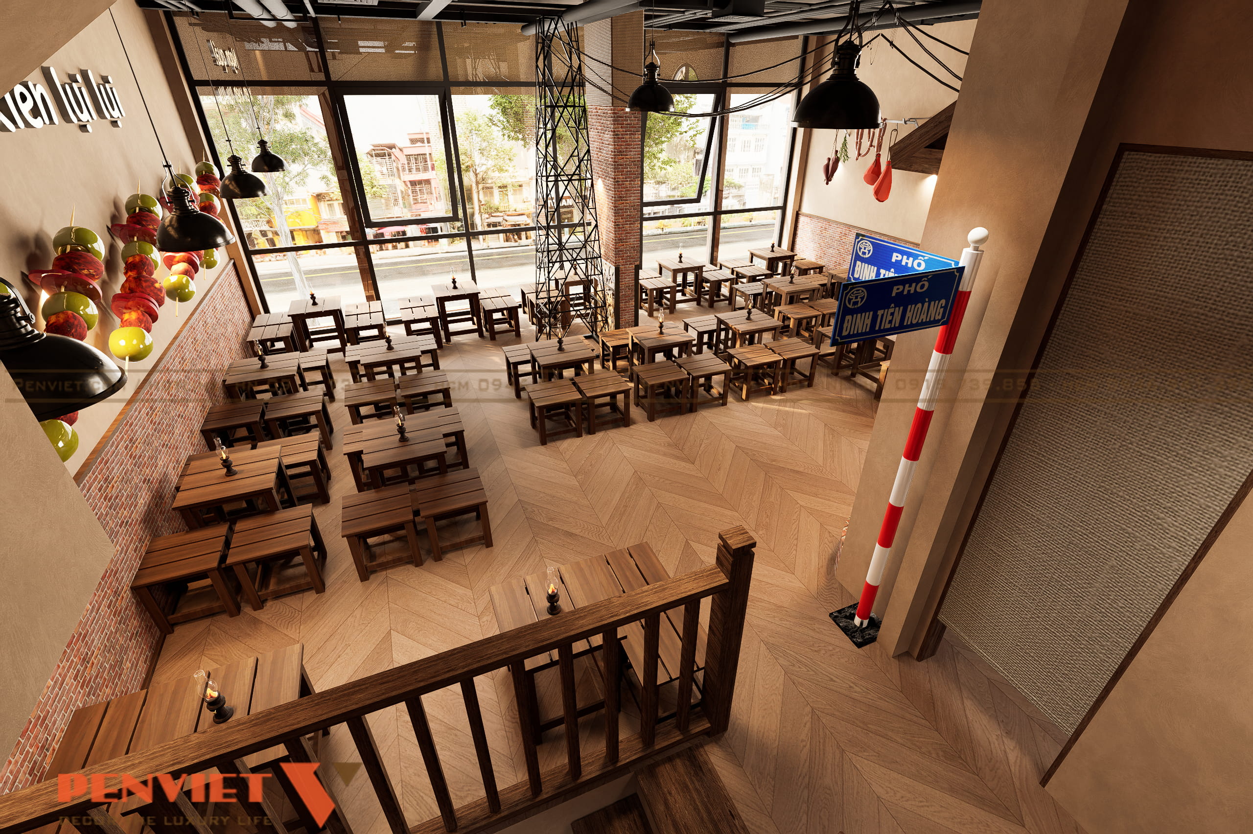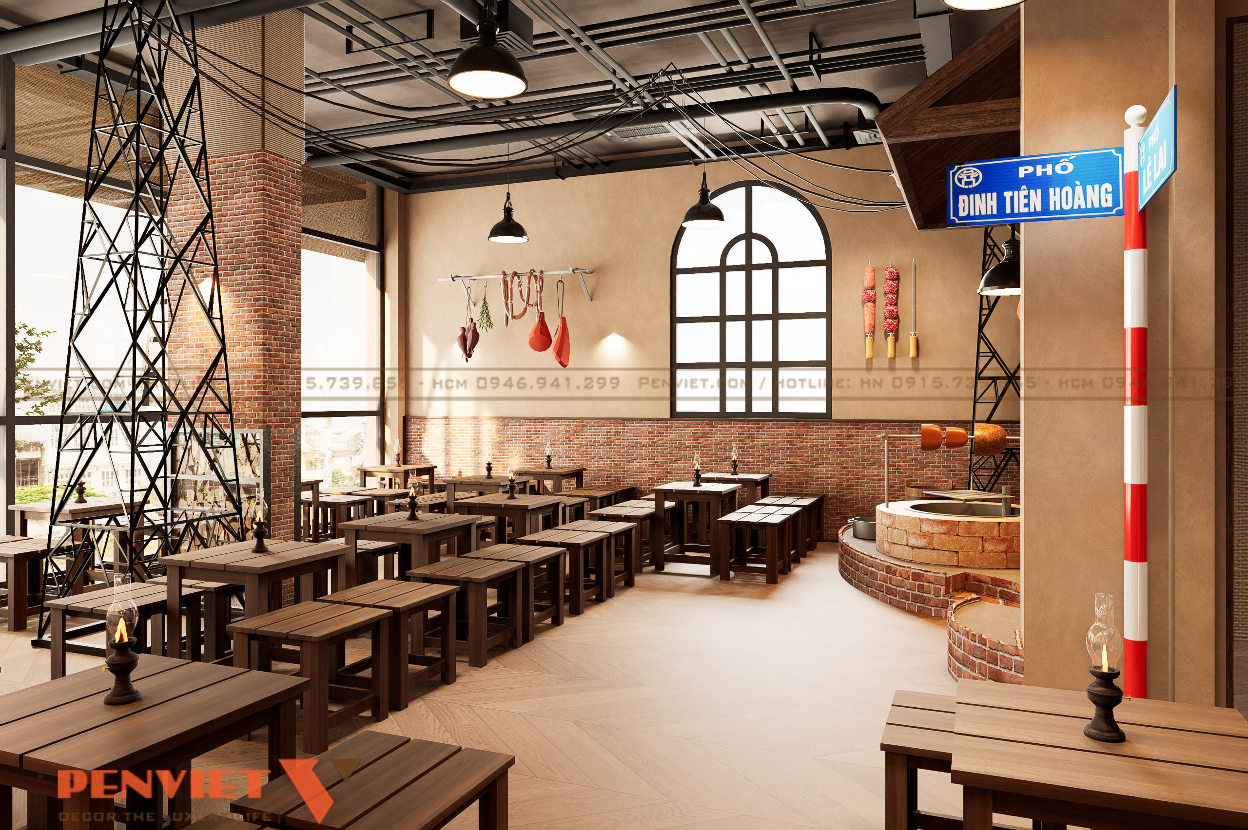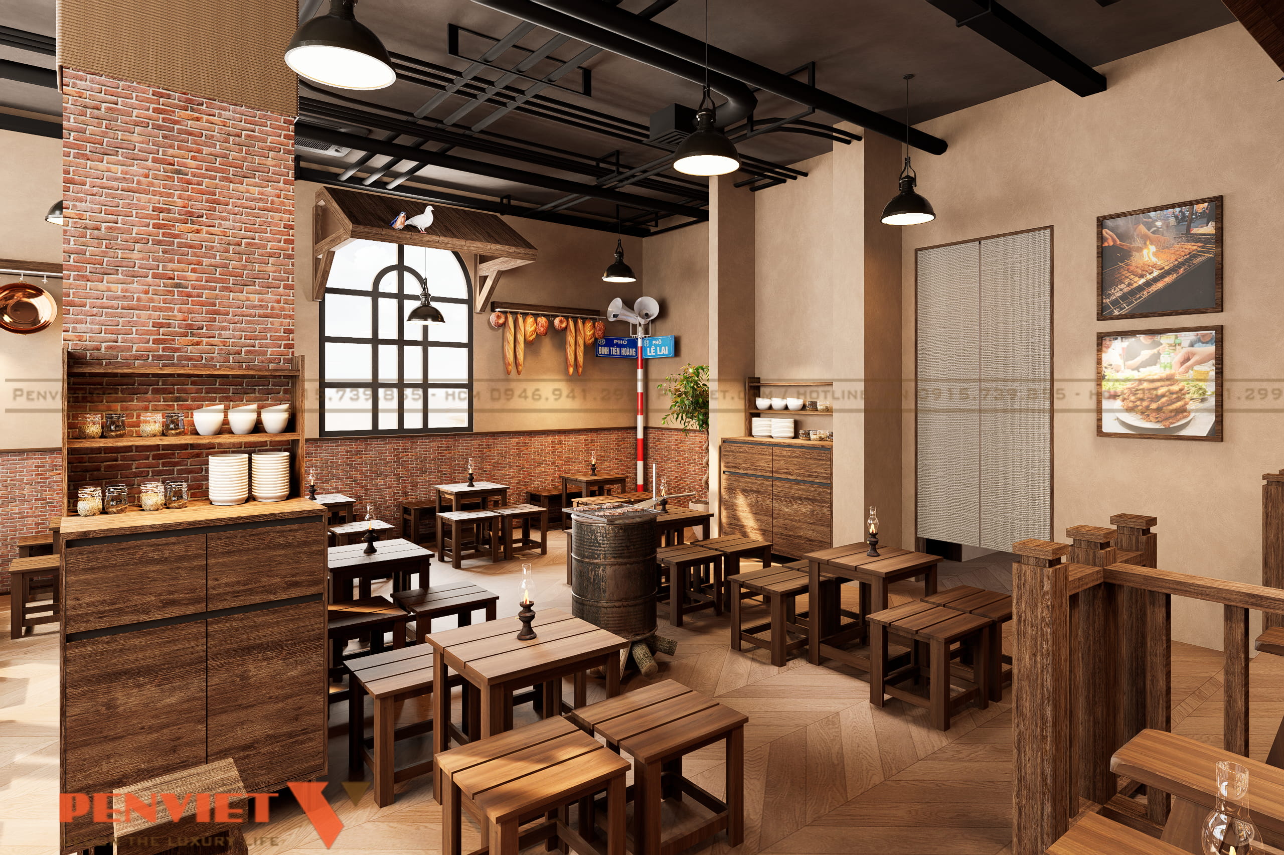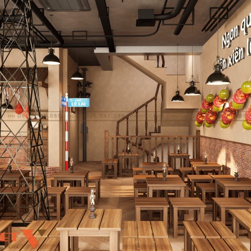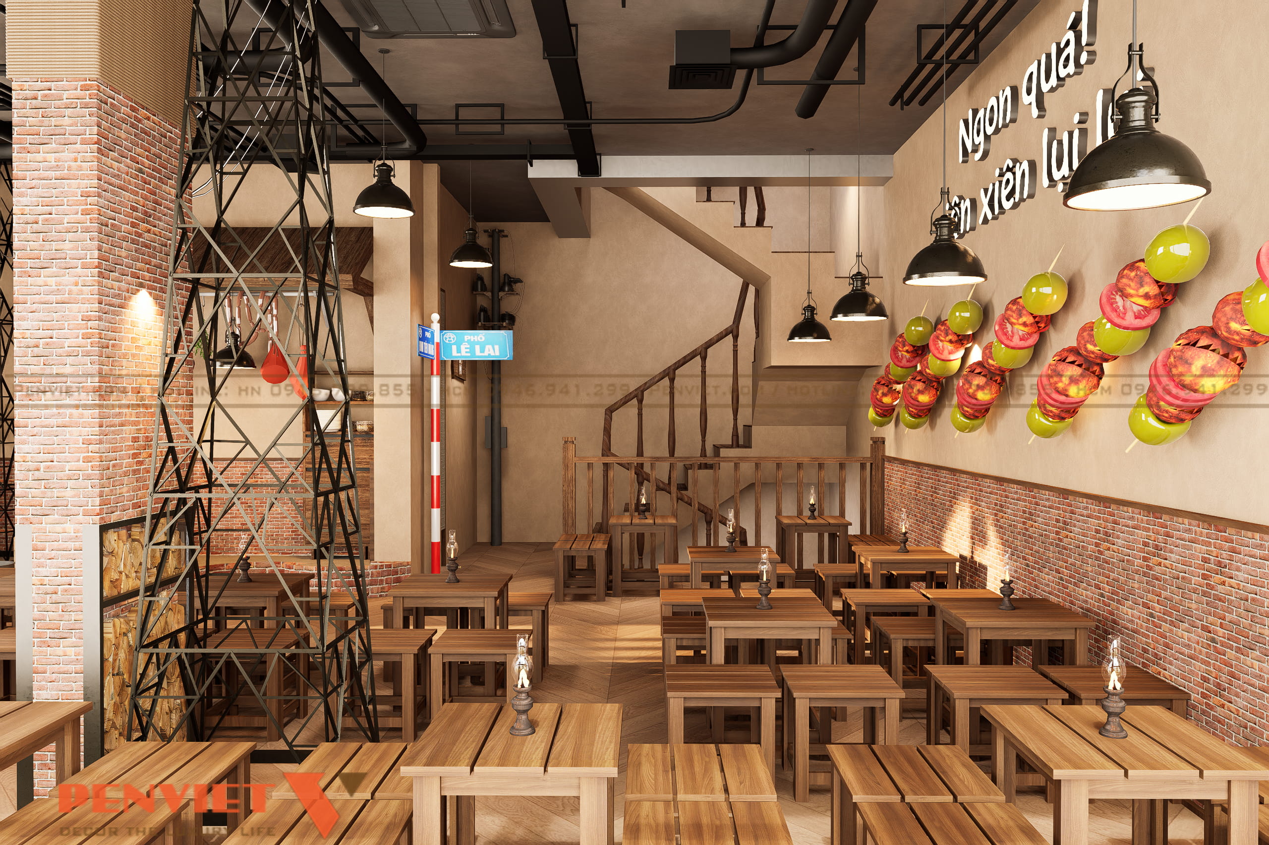 Bước vào bên trong, không gian nội thất gây ấn tượng với chất liệu gỗ chủ đạo kết hợp tường gạch thô. Sự kết hợp này mang lại cảm giác gần gũi, phù hợp với mô hình thịt xiên nướng bình dân nhưng được nâng cấp về hình ảnh. Các chủ đầu tư có thể thấy rõ lợi thế của việc chọn vật liệu dễ thi công, chi phí hợp lý và độ bền cao.