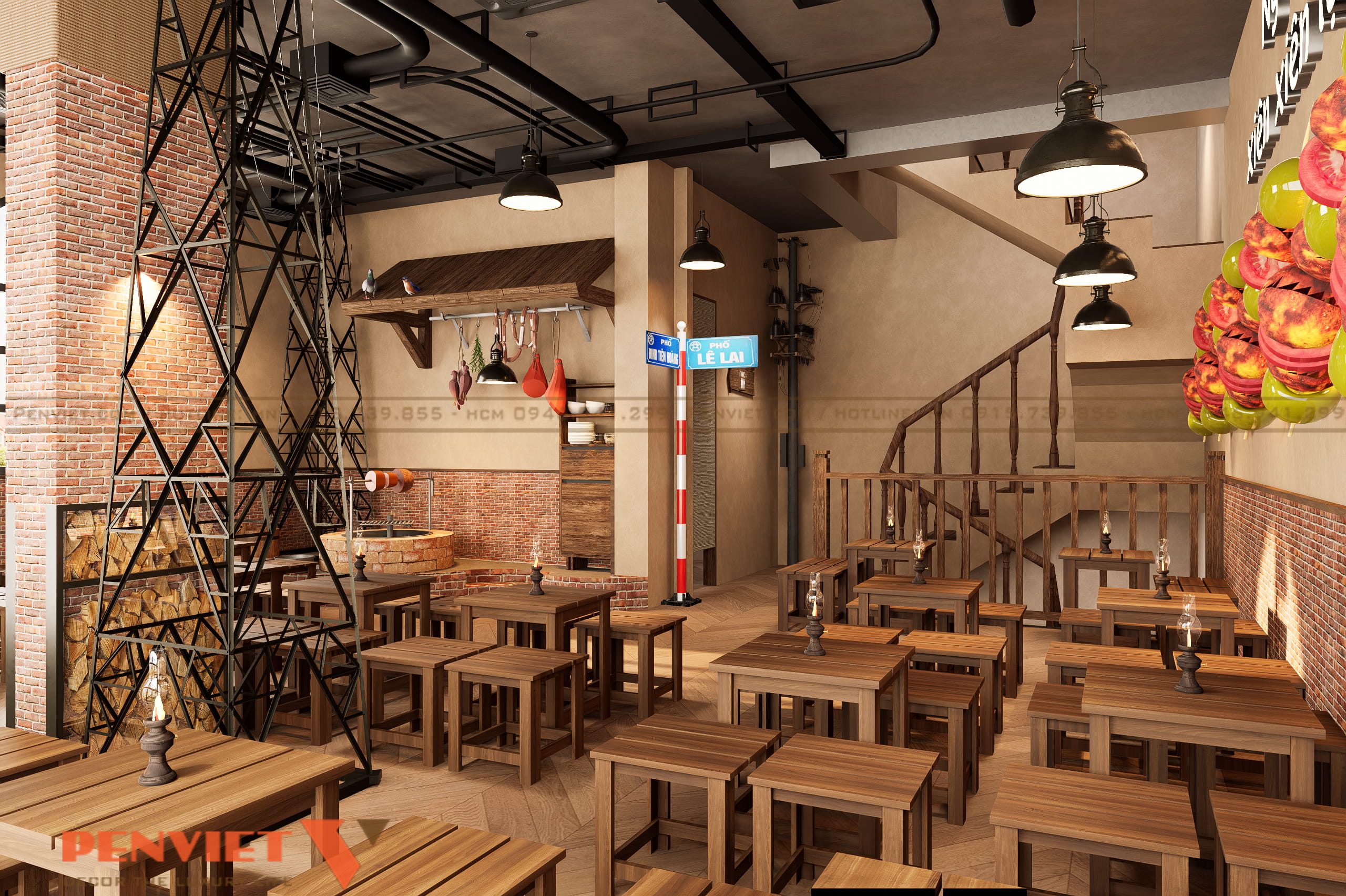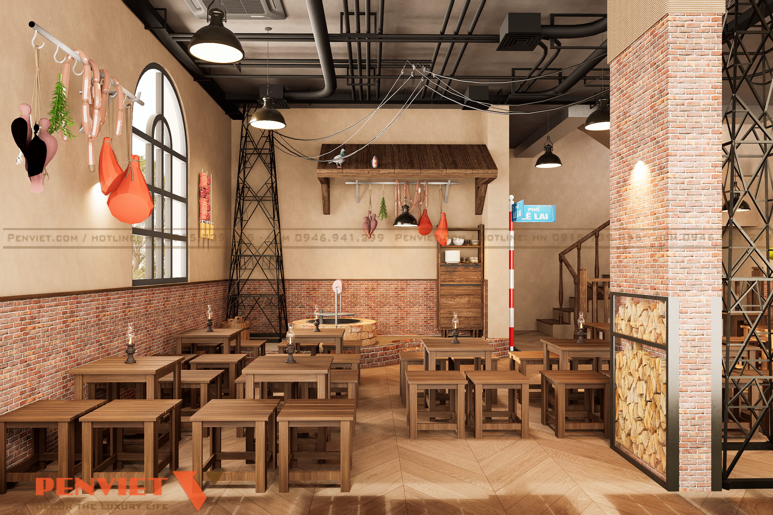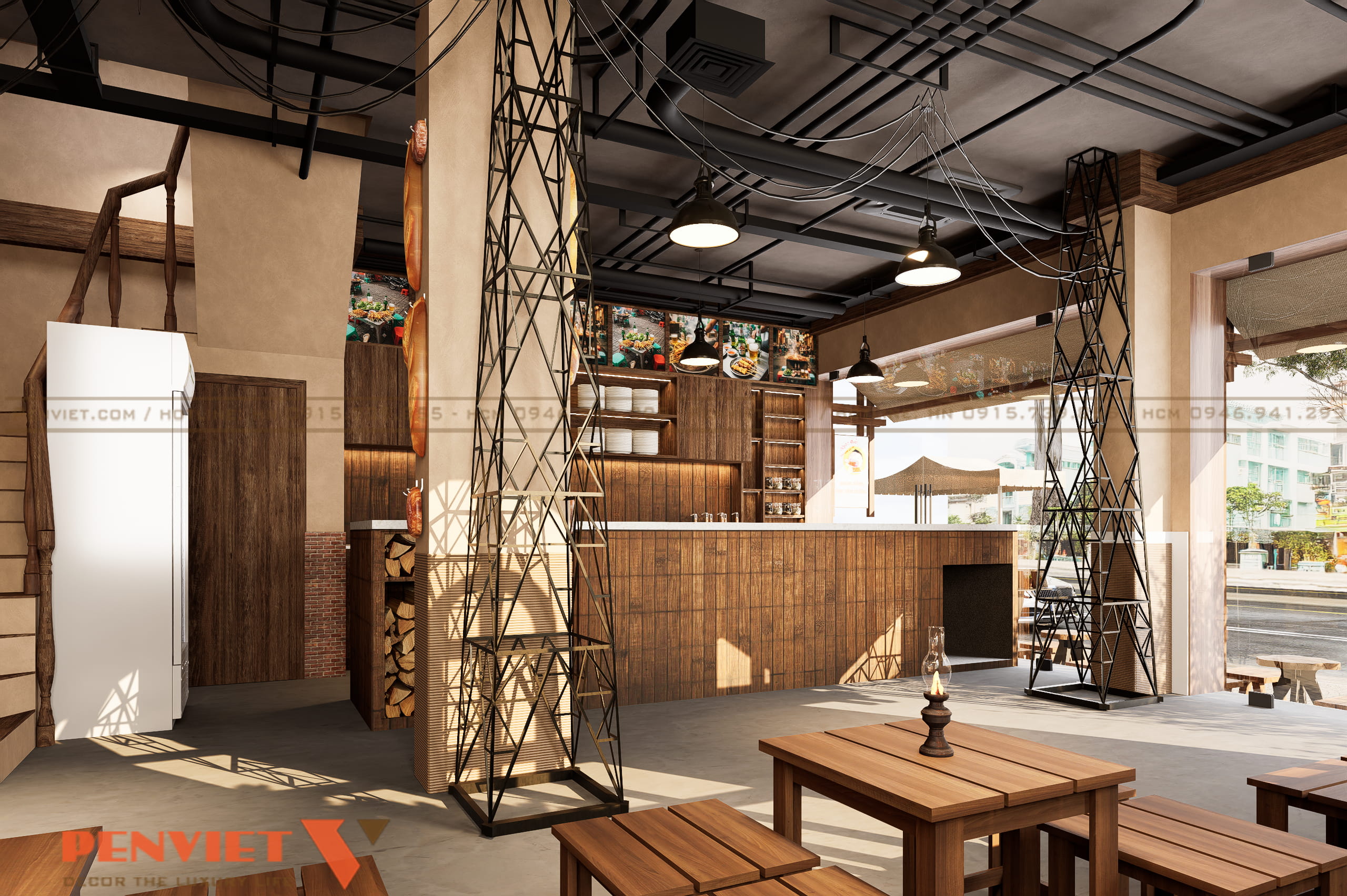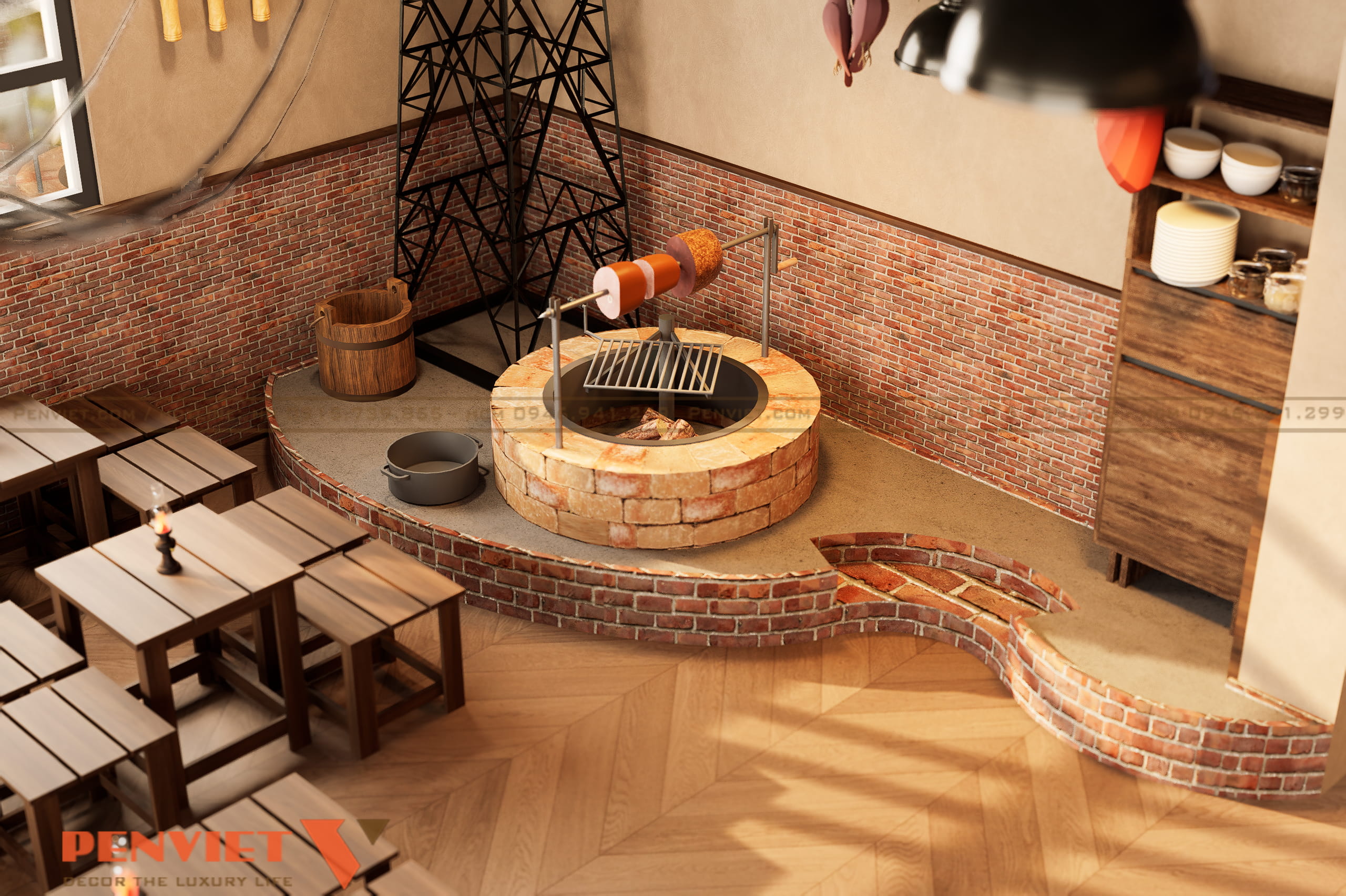 Bước vào bên trong, không gian nội thất gây ấn tượng với chất liệu gỗ chủ đạo kết hợp tường gạch thô. Sự kết hợp này mang lại cảm giác gần gũi, phù hợp với mô hình thịt xiên nướng bình dân nhưng được nâng cấp về hình ảnh. Các chủ đầu tư có thể thấy rõ lợi thế của việc chọn vật liệu dễ thi công, chi phí hợp lý và độ bền cao.