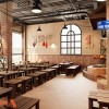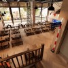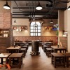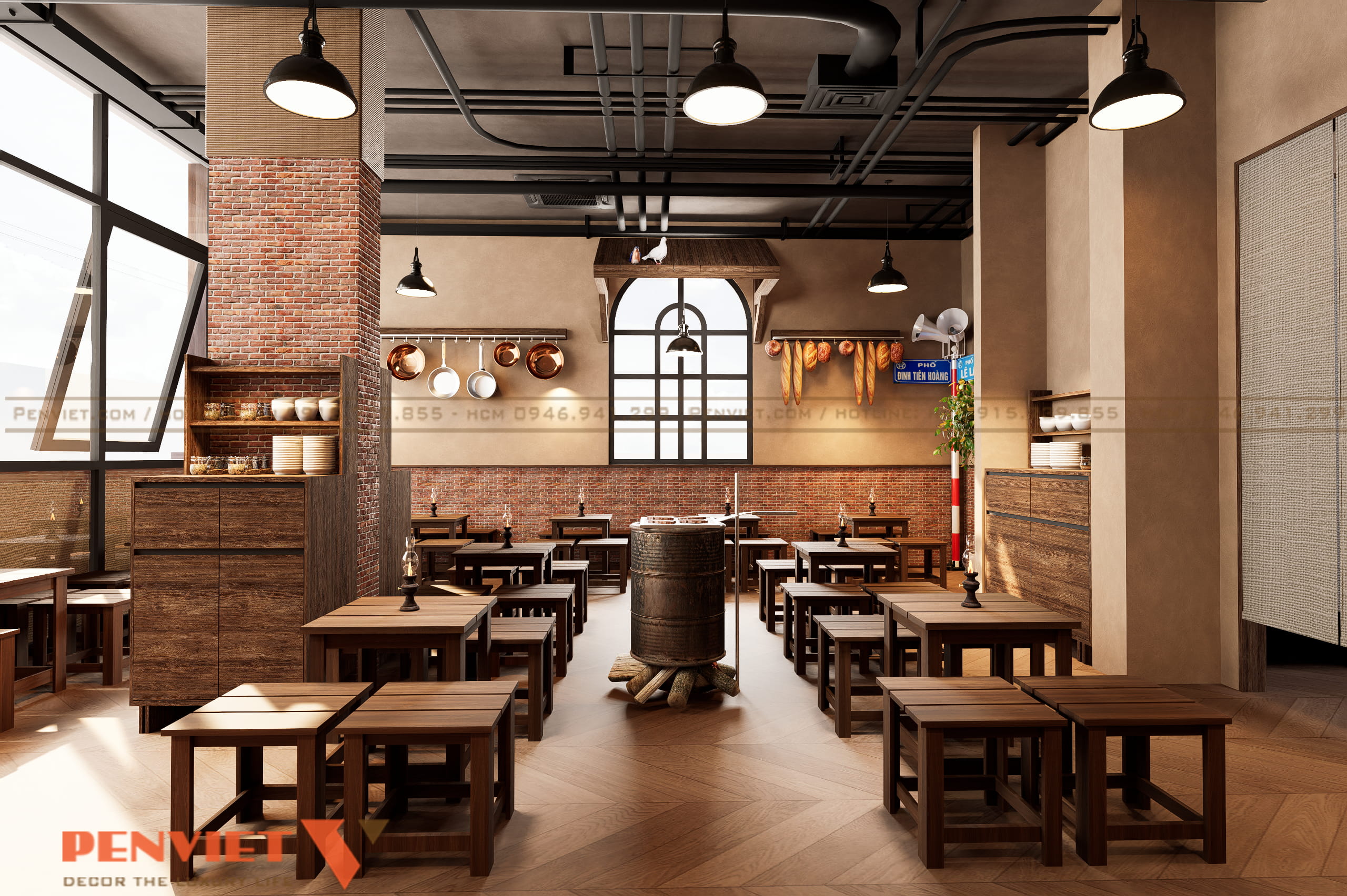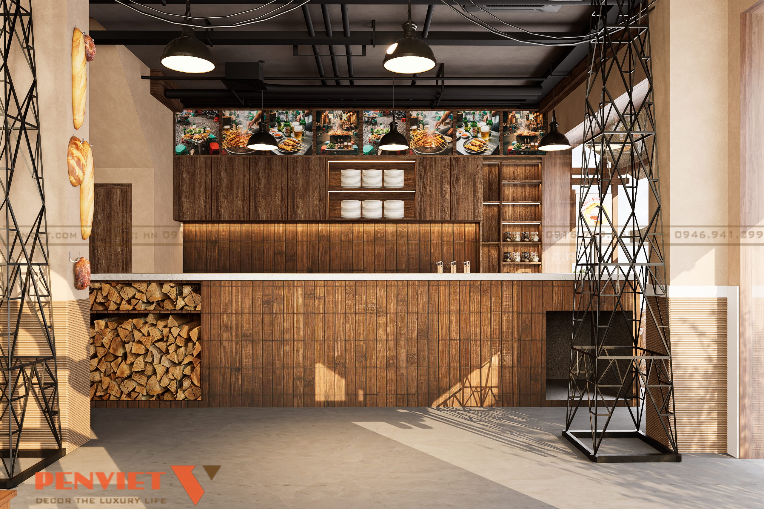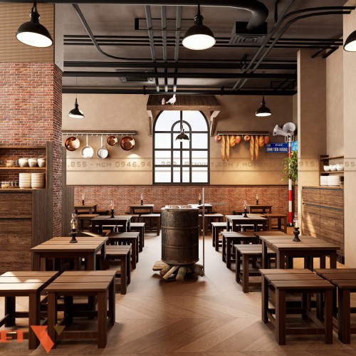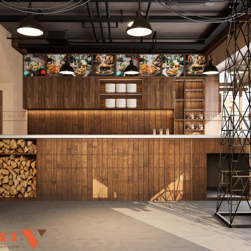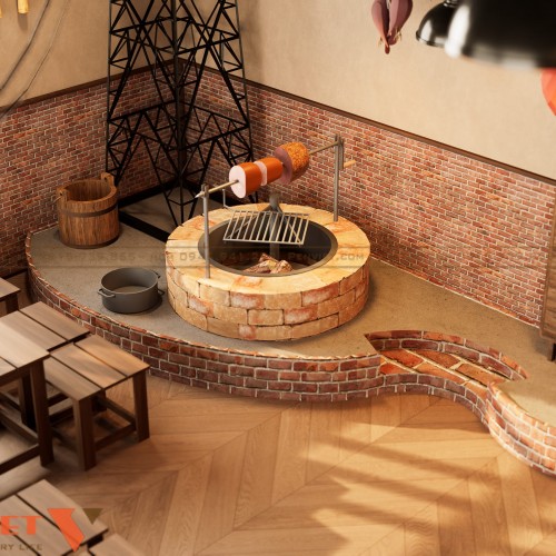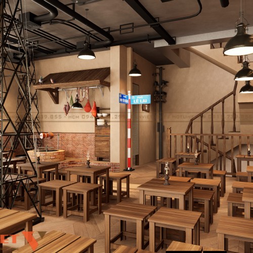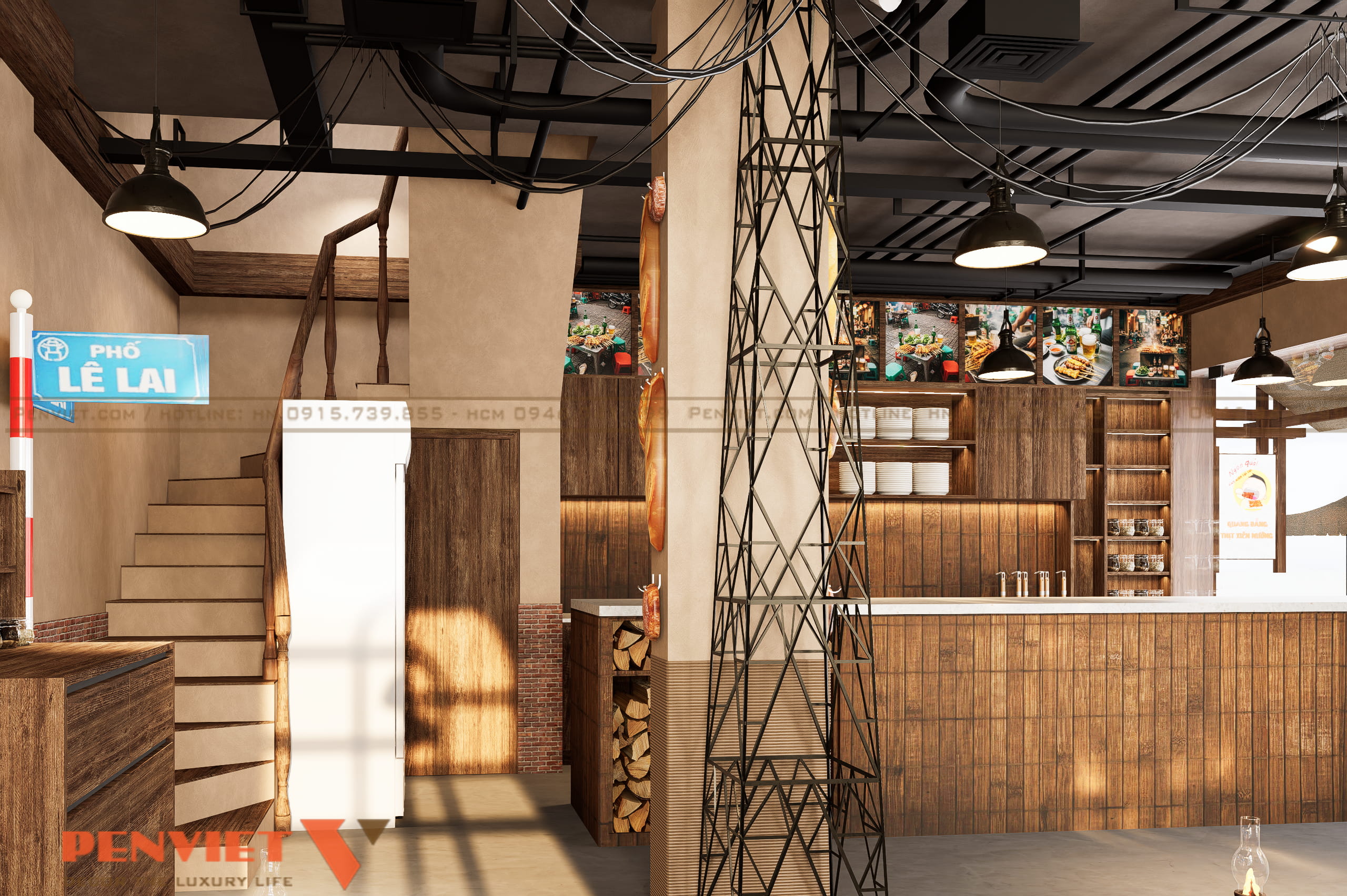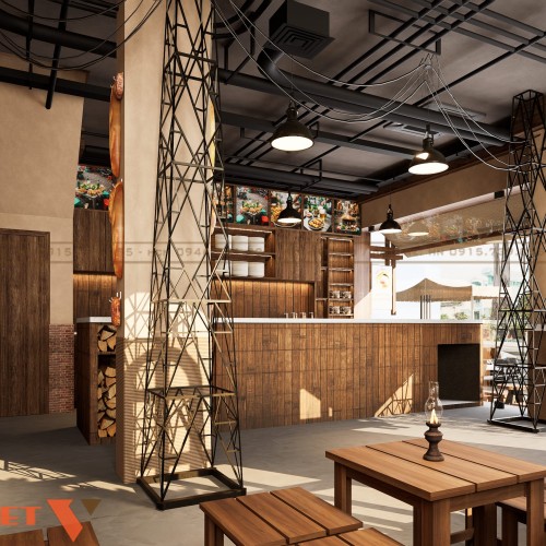 Bước vào bên trong, không gian nội thất gây ấn tượng với chất liệu gỗ chủ đạo kết hợp tường gạch thô. Sự kết hợp này mang lại cảm giác gần gũi, phù hợp với mô hình thịt xiên nướng bình dân nhưng được nâng cấp về hình ảnh. Các chủ đầu tư có thể thấy rõ lợi thế của việc chọn vật liệu dễ thi công, chi phí hợp lý và độ bền cao.