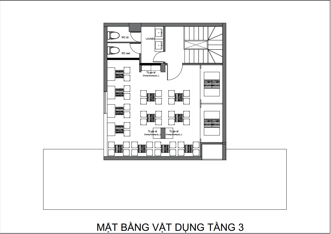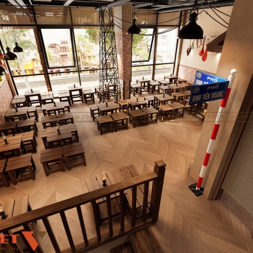 Bàn ghế được thiết kế đồng bộ, kích thước nhỏ gọn, dễ sắp xếp theo nhiều phương án. Nhờ đó, không gian có thể linh hoạt điều chỉnh theo lượng khách trong từng khung giờ. Lối đi giữa các dãy bàn được tính toán hợp lý, giúp nhân viên phục vụ thuận tiện và khách di chuyển thoải mái.