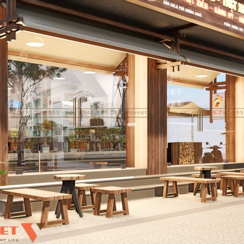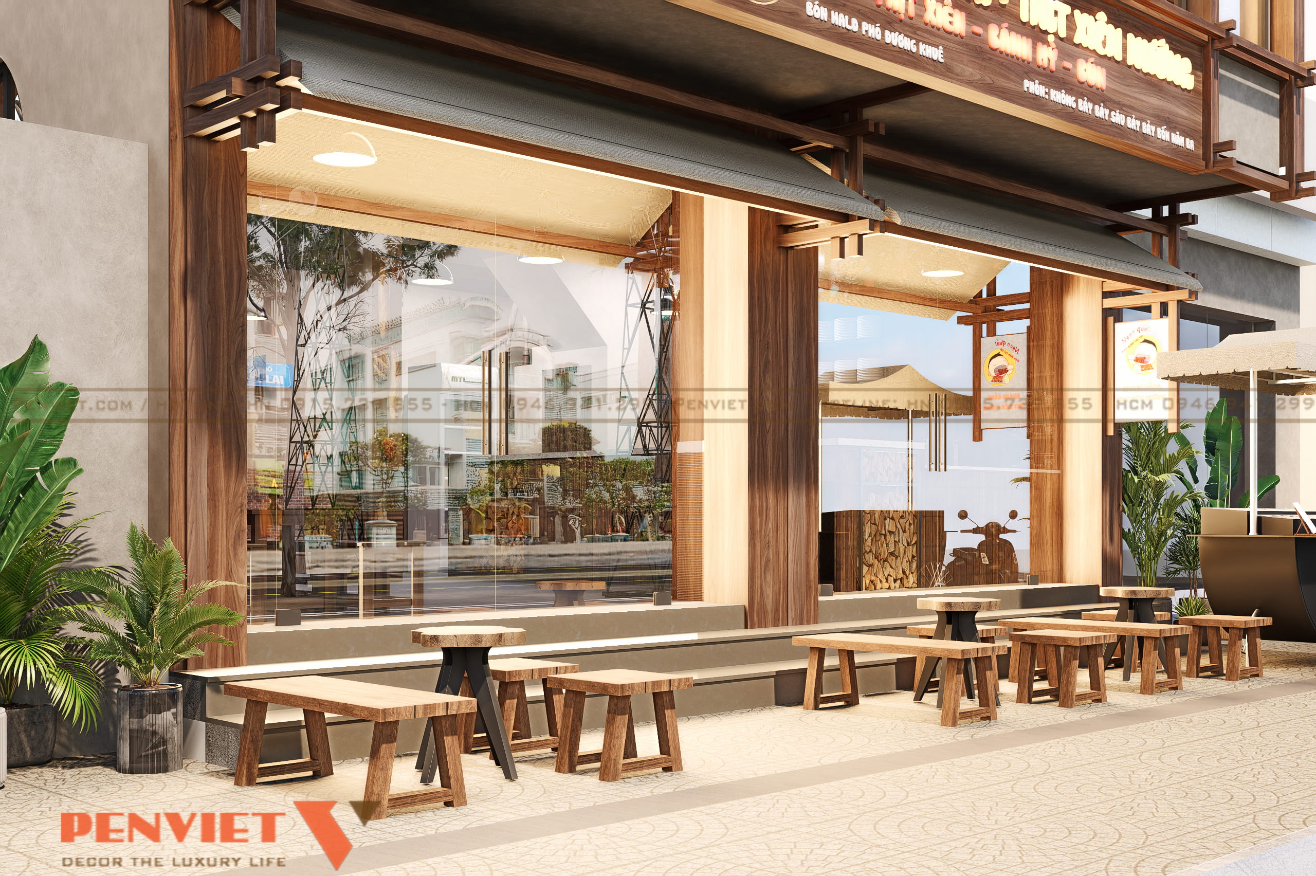 Mặt tiền cửa hàng được xử lý theo hướng mở, tận dụng tối đa chiều cao và chiều rộng nhà phố. Hệ khung gỗ kết hợp mảng kính lớn giúp không gian bên trong dễ dàng quan sát từ bên ngoài. Điều này tạo cảm giác quán luôn đông khách, kích thích người đi đường dừng lại trải nghiệm.