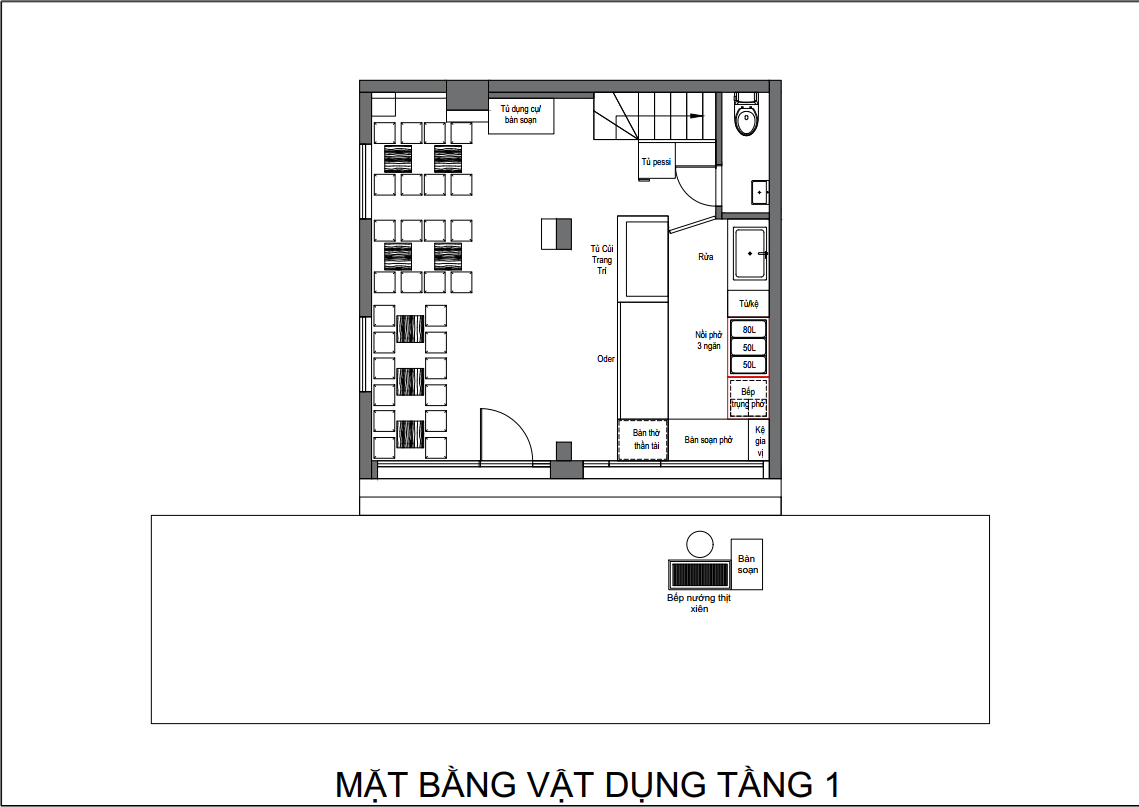Không gian vỉa hè phía trước được bố trí thêm ghế ngồi và quầy xe đẩy, tạo cảm giác thân quen của hàng ăn phố. Cách tổ chức này giúp quán linh hoạt phục vụ cả khách mua mang đi lẫn khách ngồi tại chỗ. Đồng thời, nó góp phần mở rộng diện tích kinh doanh mà vẫn tuân thủ sự gọn gàng.