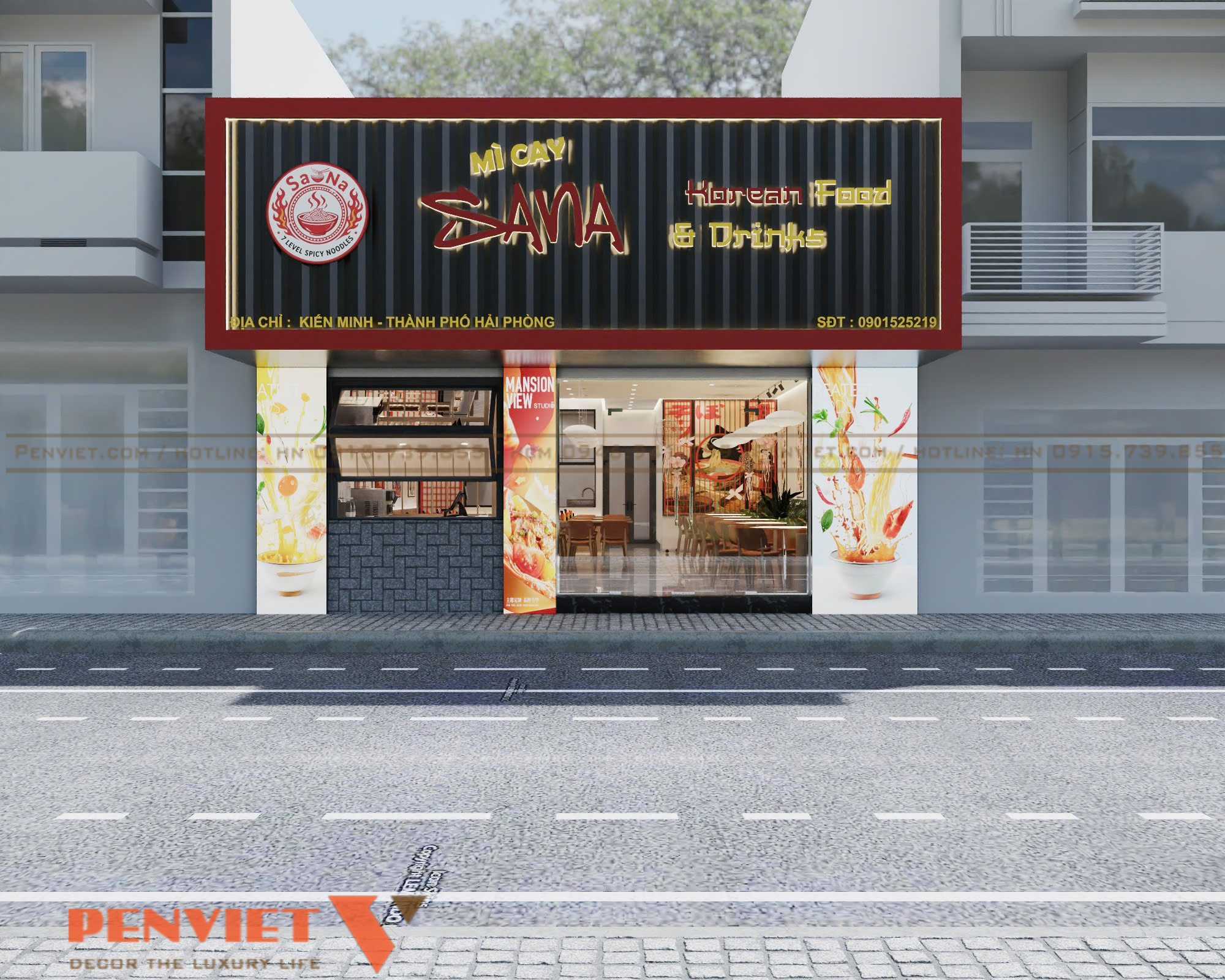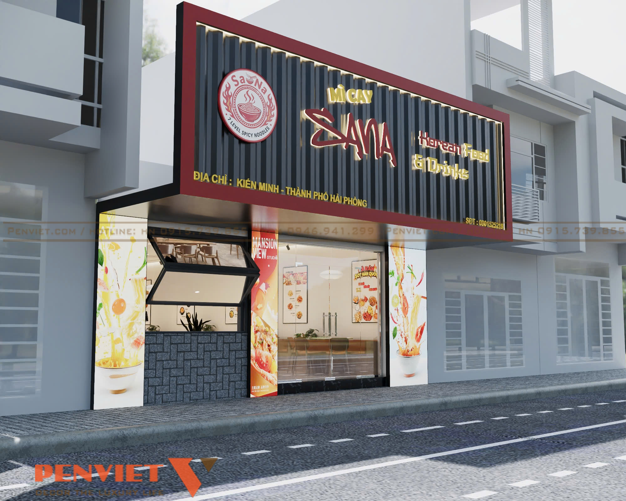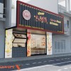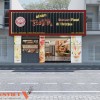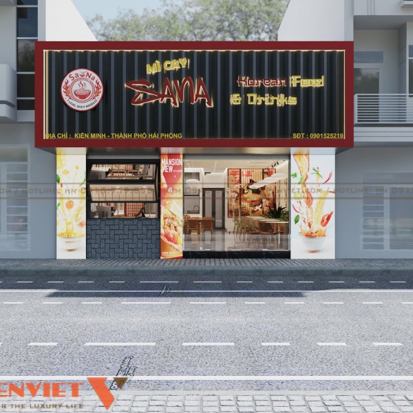Hai bên mặt tiền được trang trí hình ảnh món ăn sinh động. Chi tiết này giúp truyền tải nhanh thông điệp kinh doanh. Không gian phía trước gọn gàng, dễ tiếp cận. Đây là lợi thế lớn để tăng tỷ lệ khách ghé vào quán.