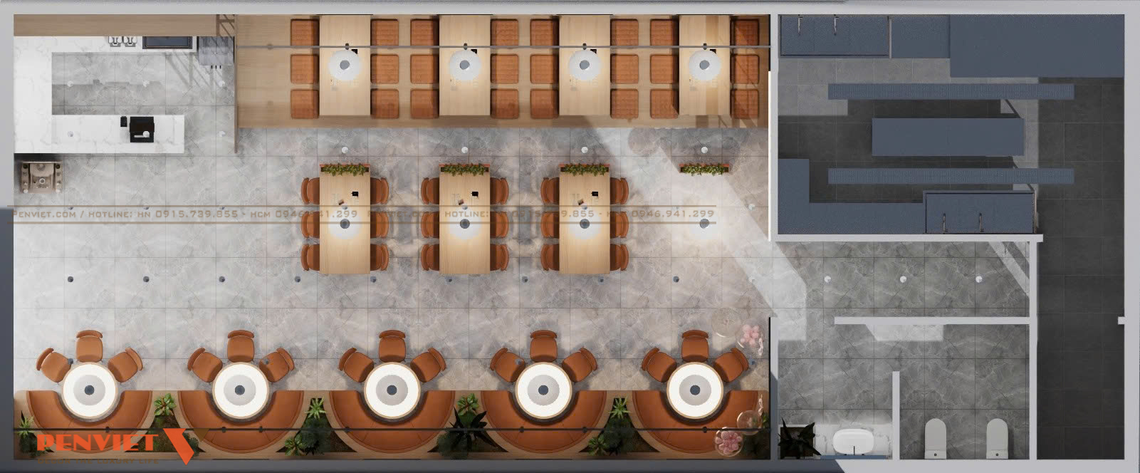 Cách tổ chức này giúp khai thác tối đa diện tích sử dụng. Đồng thời vẫn đảm bảo sự thoải mái cho khách hàng. Chủ đầu tư có thể phục vụ nhiều nhóm khách cùng lúc. Đây là điểm mạnh quan trọng trong mô hình nhà hàng.