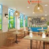 Tranh trang trí, kệ treo tường bằng gỗ MDF phun sơn 2K, gỗ MDF phủ Melamine được sử dụng linh hoạt nhằm mang đến sự sinh động cho quán cafe này.