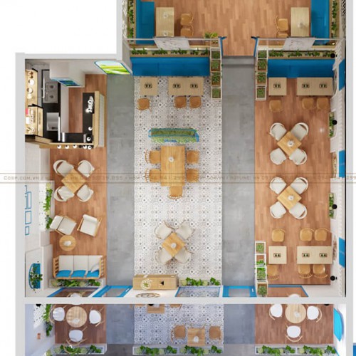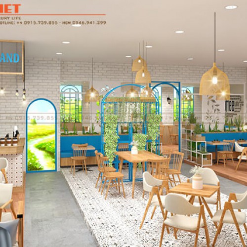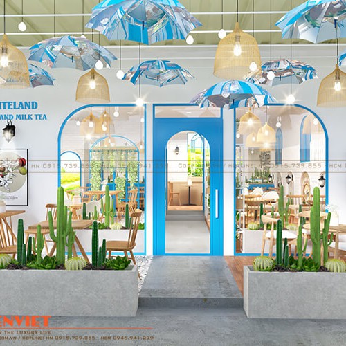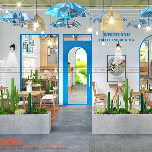 Thông qua khảo sát hiện trạng mặt bằng kết hợp lắng nghe nhu cầu của chủ đầu tư về việc sở hữu một cửa tiệm hiện đại, trẻ trung, giúp những khách hàng của Whiteland luôn cảm thấy thoải mái và thư giãn, các kiến trúc sư của chúng tôi đã đưa ra ý tưởng setup quán cafe dựa theo phong cách Tropical, sử dụng màu xanh dương kết hợp decor cây xanh để làm điểm nhấn tươi mát cho không gian.