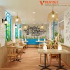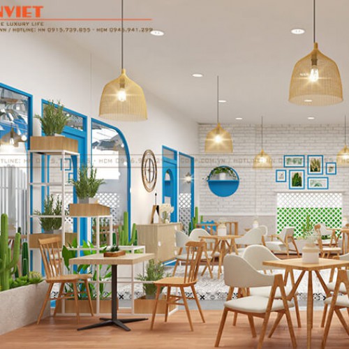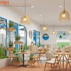 Ngoài việc sử dụng tranh in PP khung gỗ MDF phun sơn 2K, sự sáng tạo trong các chi tiết trang trí với đèn mây tre, ô treo cũng khiến cho cửa tiệm thêm phần sinh động và thu hút.