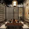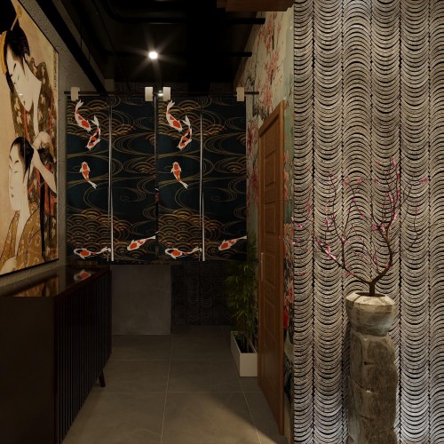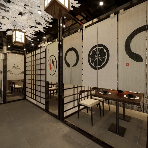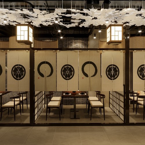 Khu vực tiếp khách chính của nhà hàng được chia thành các bàn đơn bố trí đối xứng trong không gian bán riêng tư. Đặc biệt là sử dụng rèm noren với các họa tiết truyền thống như hoa anh đào, hình tròn Enso, hoa cúc là biểu tượng quen thuộc của văn hóa Nhật Bản.