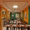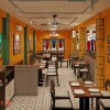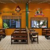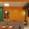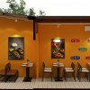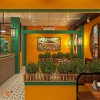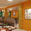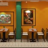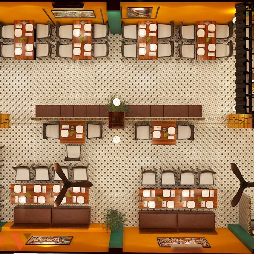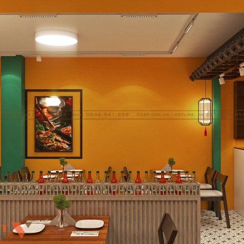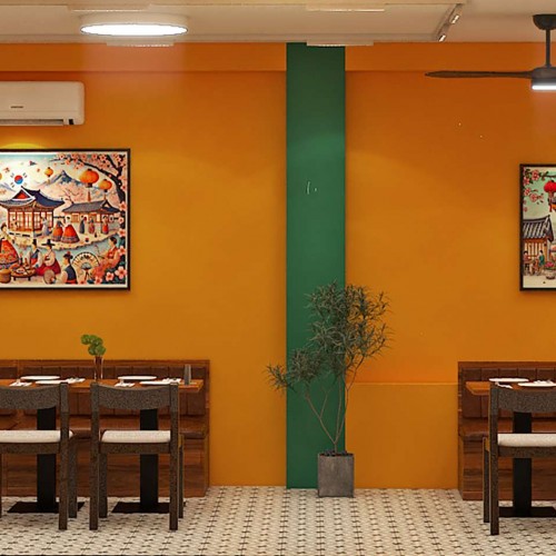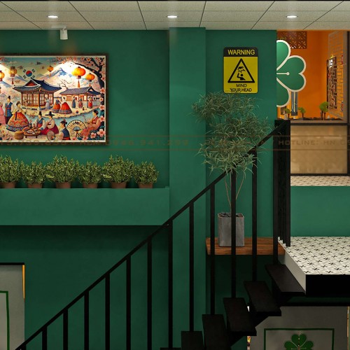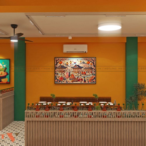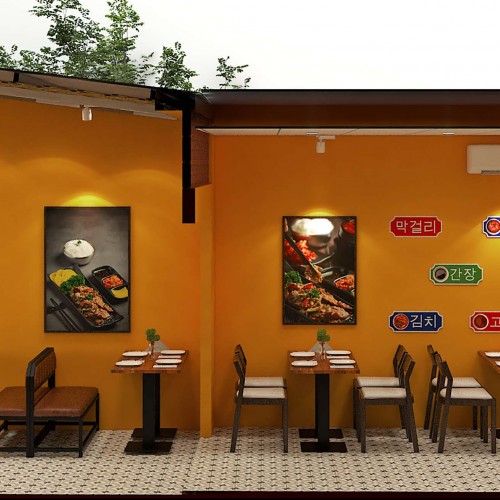Tông màu chủ đạo trong thiết kế nhà hàng Hàn Quốc này là màu vàng ấm cúng. Chúng tôi sơn các bức tường trong nhà hàng và cả mặt tiền màu vàng chủ đạo tạo nên sự thống nhất trong ý tưởng thiết kế nhà hàng. Ngoài ra còn trang trí các bức tranh hình ảnh truyền thống Hàn Quốc như hanbok, mái nhà cổ, cánh đồng hoa cải vàng… Những chi tiết nhỏ xinh này sẽ làm tăng thêm cho người nhìn cảm giác chân thực về văn hóa đặc trưng Hàn Quốc.