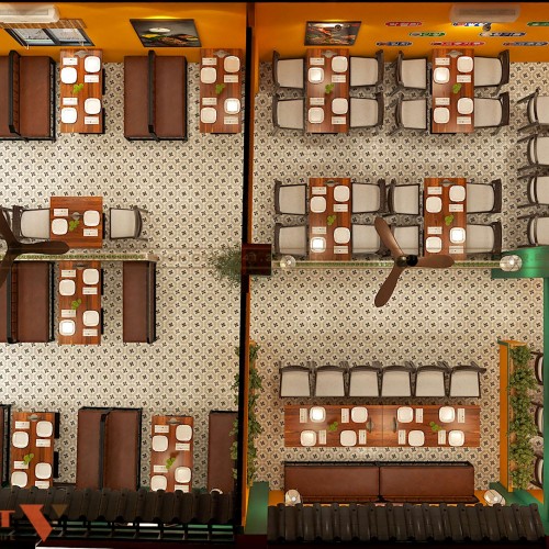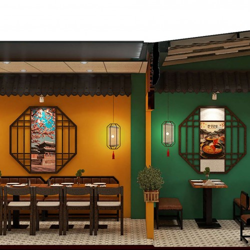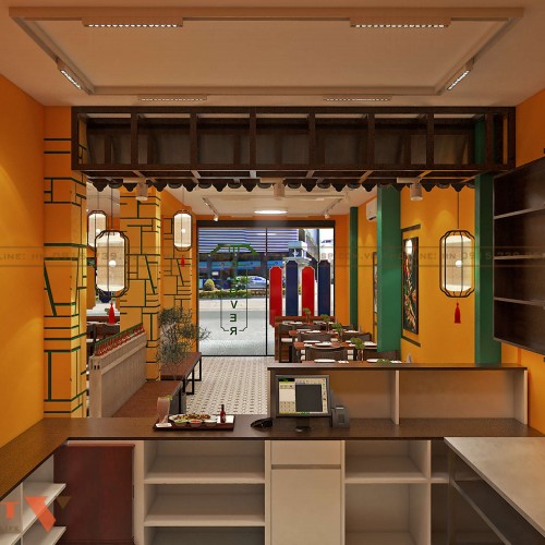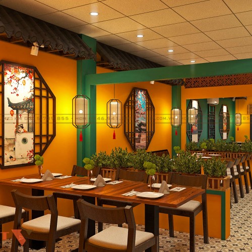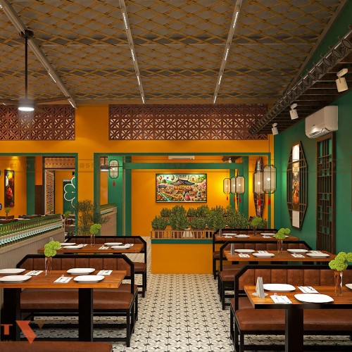 Đèn trang trí là yếu tố quan trọng tạo nên bầu không khí và màu sắc của nhà hàng. Những chiếc đèn lồng bằng giấy hay đèn thả trần mang ánh sáng vàng ấm áp tạo cảm giác dễ chịu và gần gũi. Bên cạnh đó, việc sử dụng các vách ngăn bằng gỗ giữa các bàn ăn tạo ra sự riêng tư và tăng tính thẩm mỹ cho không gian.