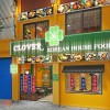 Khu vực quầy lễ tân mang phong cách Hàn Quốc sử dụng chi tiết gỗ tự nhiên kết hợp với đèn lồng giấy theo phong cách truyền thống. Màu sắc chủ đạo với gam màu ấm như nâu, đỏ gạch, vàng nhạt rất ấm áp.
