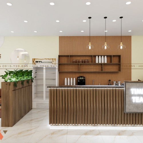 Logo "TIME TEA" được đặt tại quầy pha chế là điểm nhấn nổi bật, thu hút sự chú ý của khách hàng ngay từ khi bước vào. Logo được làm từ chất liệu mica, kết hợp với đèn LED chiếu sáng, tạo hiệu ứng thị giác bắt mắt. Quầy pha chế không chỉ là nơi phục vụ đồ uống mà còn là trung tâm của không gian, góp phần định hình phong cách tổng thể của quán.