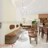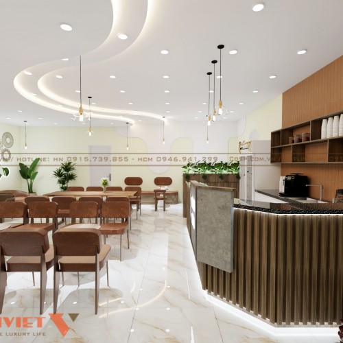 Ngoài nội thất thì ánh sáng là yếu tố không thể thiếu trong việc định hình không gian và tạo cảm giác thoải mái cho thực khách. Hệ thống đèn LED được lắp đặt khéo léo, bao gồm đèn âm trần và đèn thả. Đèn âm trần cung cấp ánh sáng tổng thể, giúp không gian sáng sủa và rộng rãi. Đèn thả với chụp thủy tinh mang đến ánh sáng dịu nhẹ, tạo điểm nhấn tại các khu vực bàn ghế hoặc quầy pha chế.