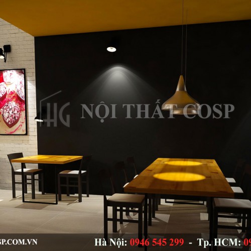 Tiếp theo là những bộ bàn ghế được chúng tôi lựa chọn với chất liệu gỗ melamine cao cấp cùng kiểu dáng đơn giản, gọn gàng. Khu vực phía trong, mặt tường được sơn đen giúp tạo chiều sâu cho không gian cửa hàng.