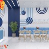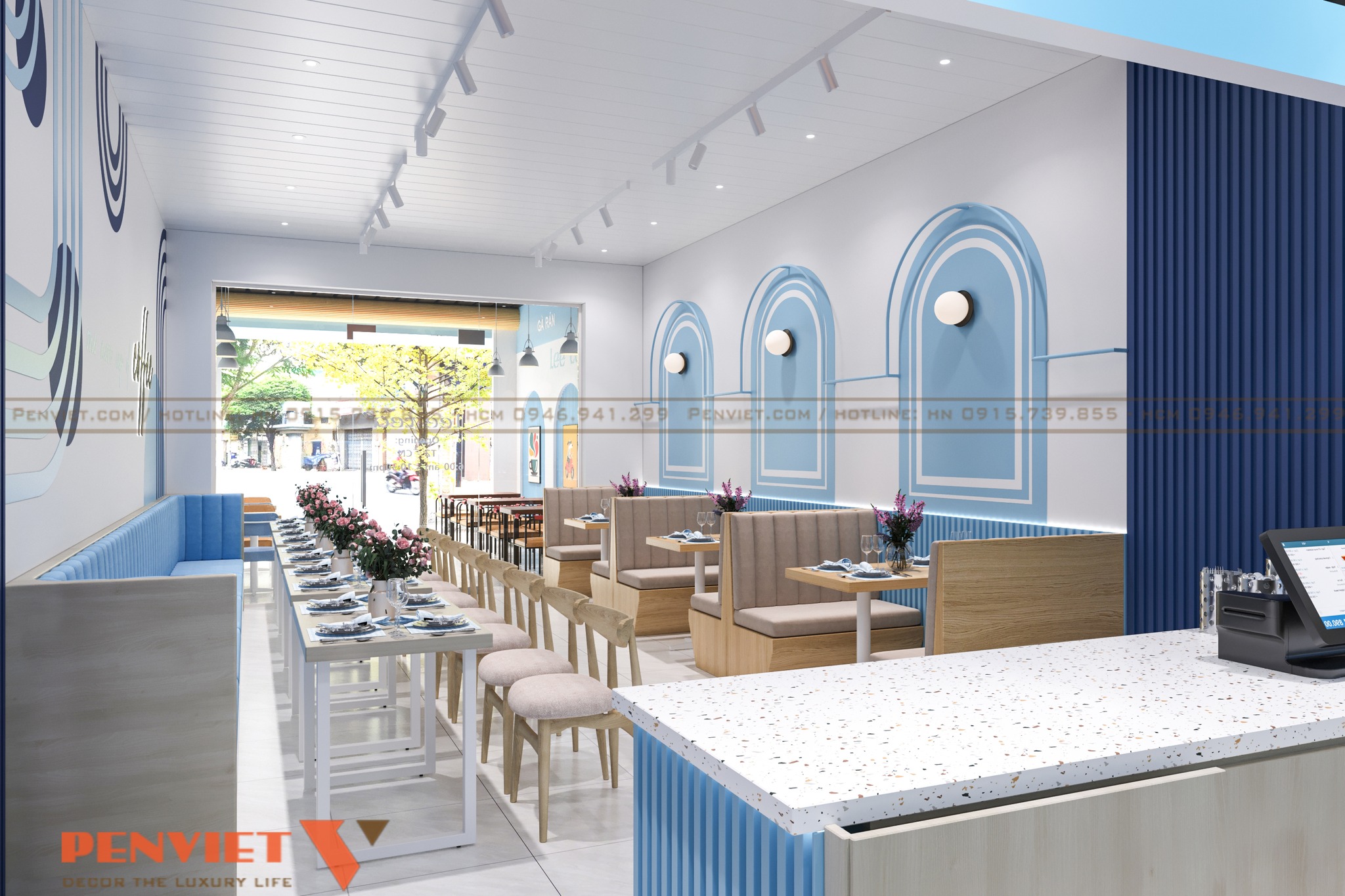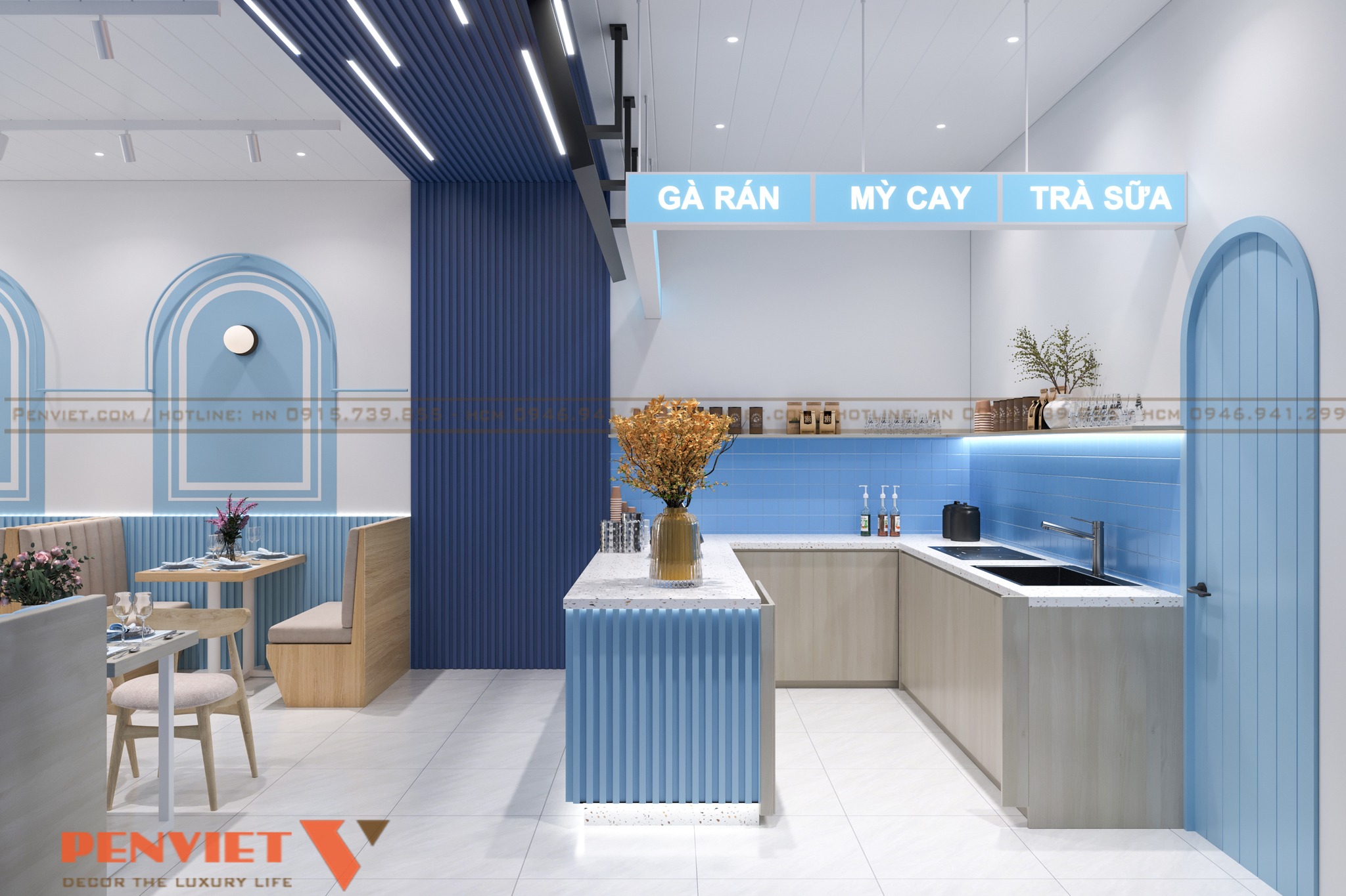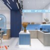 Không gian sử dụng tông xanh trắng làm chủ đạo. Màu sắc này giúp cửa hàng nổi bật ngay từ mặt tiền. Ban đêm, hệ biển sáng tạo điểm nhấn thu hút người đi đường.