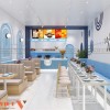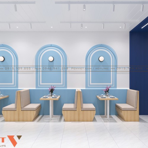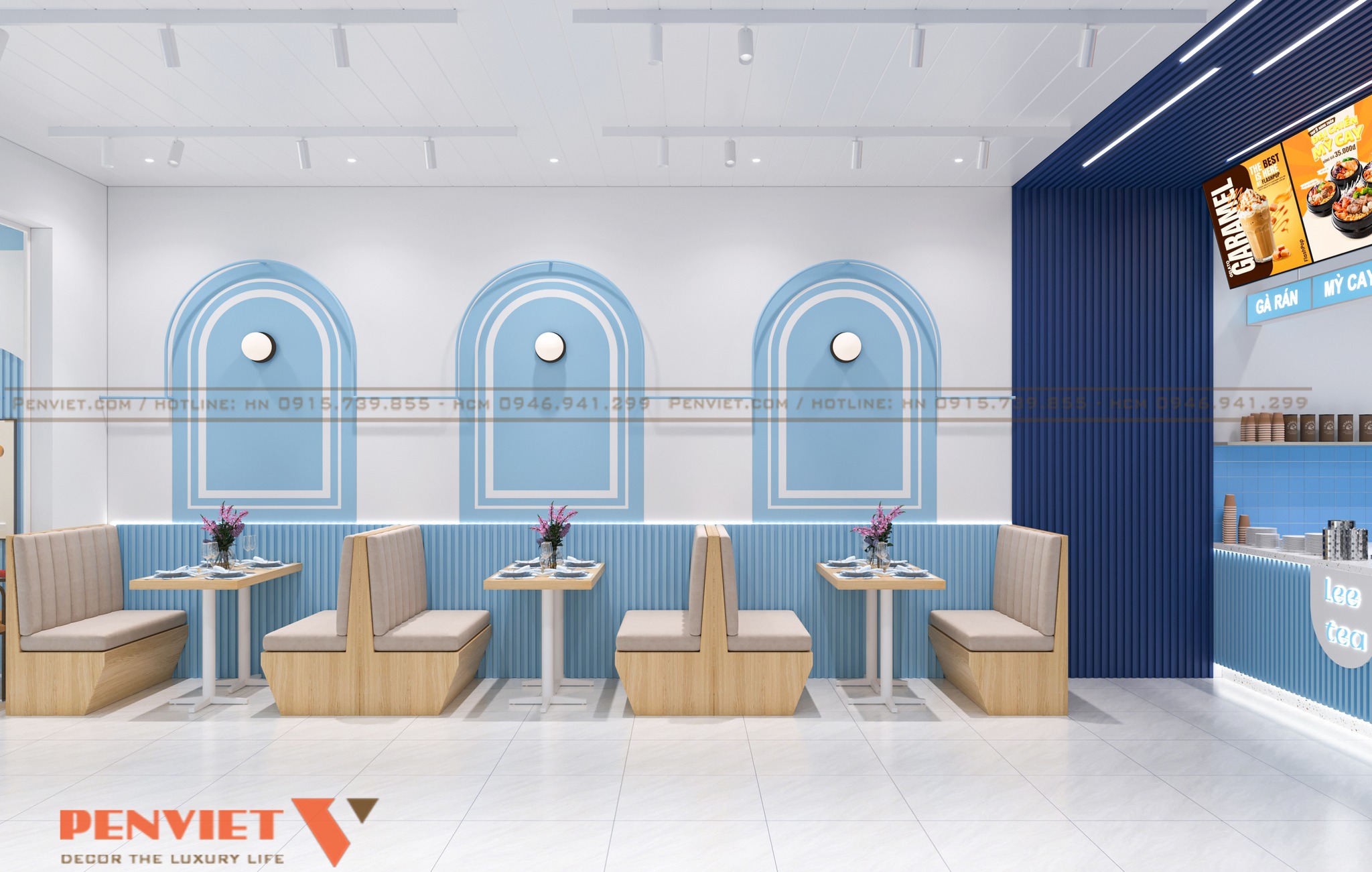 Các mảng tường được tạo hình vòm mềm mại. Chi tiết này giúp không gian bớt đơn điệu. Đồng thời tạo điểm check-in cho khách. Hệ đèn trần bố trí đều. Ánh sáng trắng giúp không gian sạch sẽ hơn. Điều này rất quan trọng với ngành F&B.