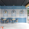 Phía sau quầy bố trí hệ kệ gọn gàng. Các thiết bị được sắp xếp khoa học. Điều này giúp rút ngắn thời gian pha chế. Menu được đặt phía trên, dễ nhìn. Nội dung rõ ràng, màu sắc nổi bật. Khách có thể lựa chọn nhanh mà không mất thời gian hỏi.