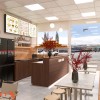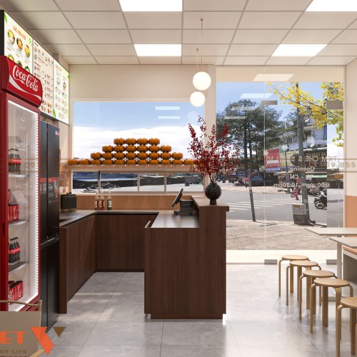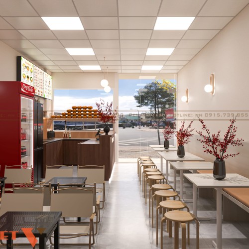 Tông màu trung tính kết hợp điểm nhấn đỏ giúp không gian trẻ trung và dễ liên tưởng đến đồ ăn nhanh. Hệ menu treo cao, dễ nhìn từ mọi vị trí trong cửa hàng. Trang trí được tiết chế, tập trung vào sản phẩm và quầy bán. Tổng thể thiết kế giúp chủ đầu tư dễ vận hành, dễ nhân rộng mô hình trong tương lai.