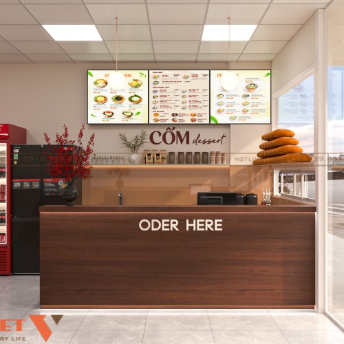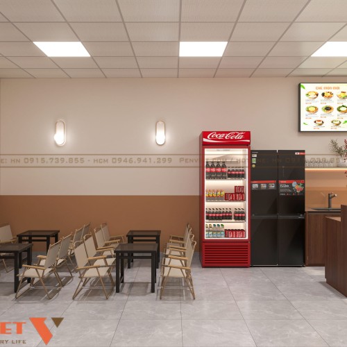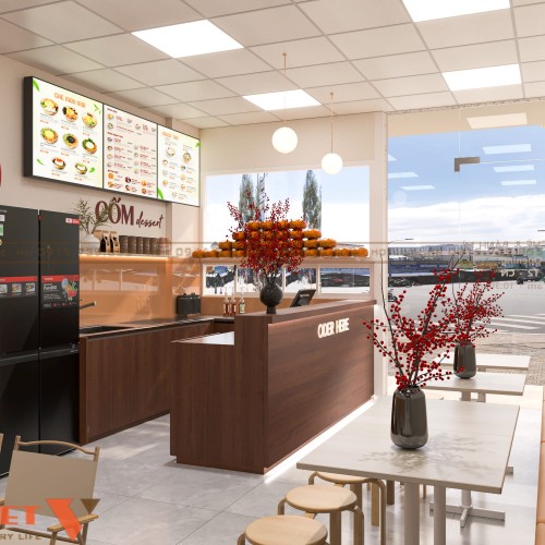 Không gian bên trong được chia rõ ràng giữa khu vực quầy bán và khu vực ngồi ăn. Quầy phục vụ đặt sát tường, tích hợp tủ trưng bày và khu chuẩn bị món, giúp nhân viên thao tác nhanh. Lối đi giữa cửa hàng thông thoáng, không bị cản trở dù diện tích nhỏ. Cách bố trí này giúp tối ưu dòng di chuyển của khách và tăng hiệu suất bán hàng.