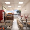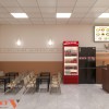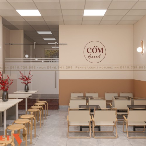 Thiết kế ưu tiên bàn dài áp tường kết hợp ghế đôn nhỏ gọn để tiết kiệm diện tích. Cách sắp xếp này cho phép phục vụ nhiều khách cùng lúc mà không gây cảm giác chật chội. Ánh sáng trắng kết hợp ánh sáng trang trí tạo không gian sáng sủa, sạch sẽ. Khu ngồi phù hợp cho khách ăn nhanh, chờ mang đi hoặc dừng chân ngắn.