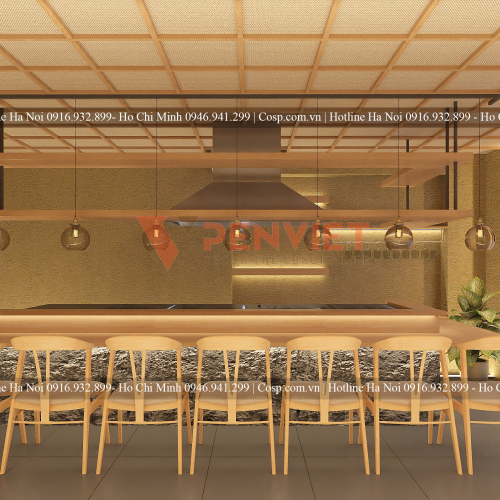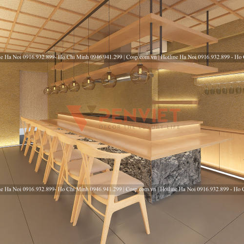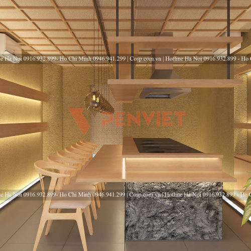 Tiếp đến là phần thiết kế nội thất nhà hàng. Đầu tiên tôi xin giới thiệu chiếc bàn ở giữa chiếm diện tích lớn nhất không gian. Đây là chiếc bàn ăn kiêm bàn phục vụ, mặt bàn được làm gỗ teak nguyên tấm dày 6 ly; Khung inox nguyên tấm 304; Bếp nướng âm; Hộp kệ để đồ inox 304; Đèn led trang trí gầm bàn và mặt bàn đặc biệt gây sự chú ý là chân bàn được ốp đá sỏi trang trí rất thu hút. Chiếc bàn đang được PenViet cung cấp với gái dao động từ 5.500.000/m2 - 6.500.000/m2.