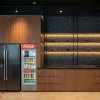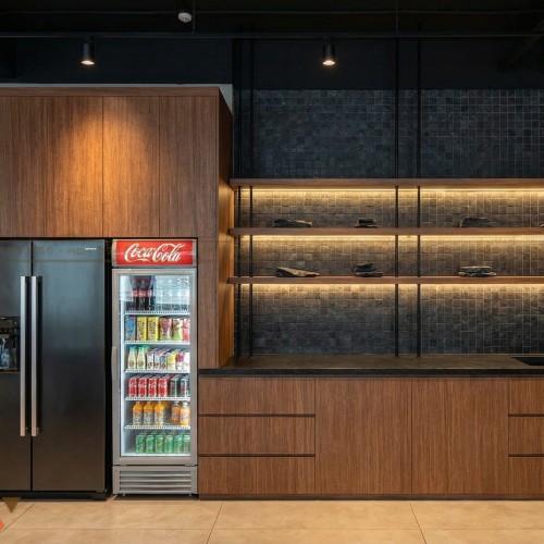 Quầy phục vụ được bố trí dọc theo tường, tiết kiệm diện tích. Mặt quầy gọn gàng, dễ vệ sinh và vận hành. Hệ tủ phía sau giúp lưu trữ hiệu quả.