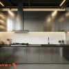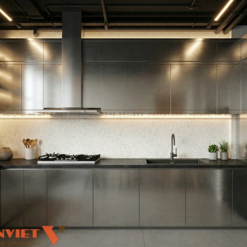 Khu bếp được bố trí kín nhưng vẫn liên kết với quầy. Điều này giúp kiểm soát mùi và giữ sự sạch sẽ cho không gian chung.