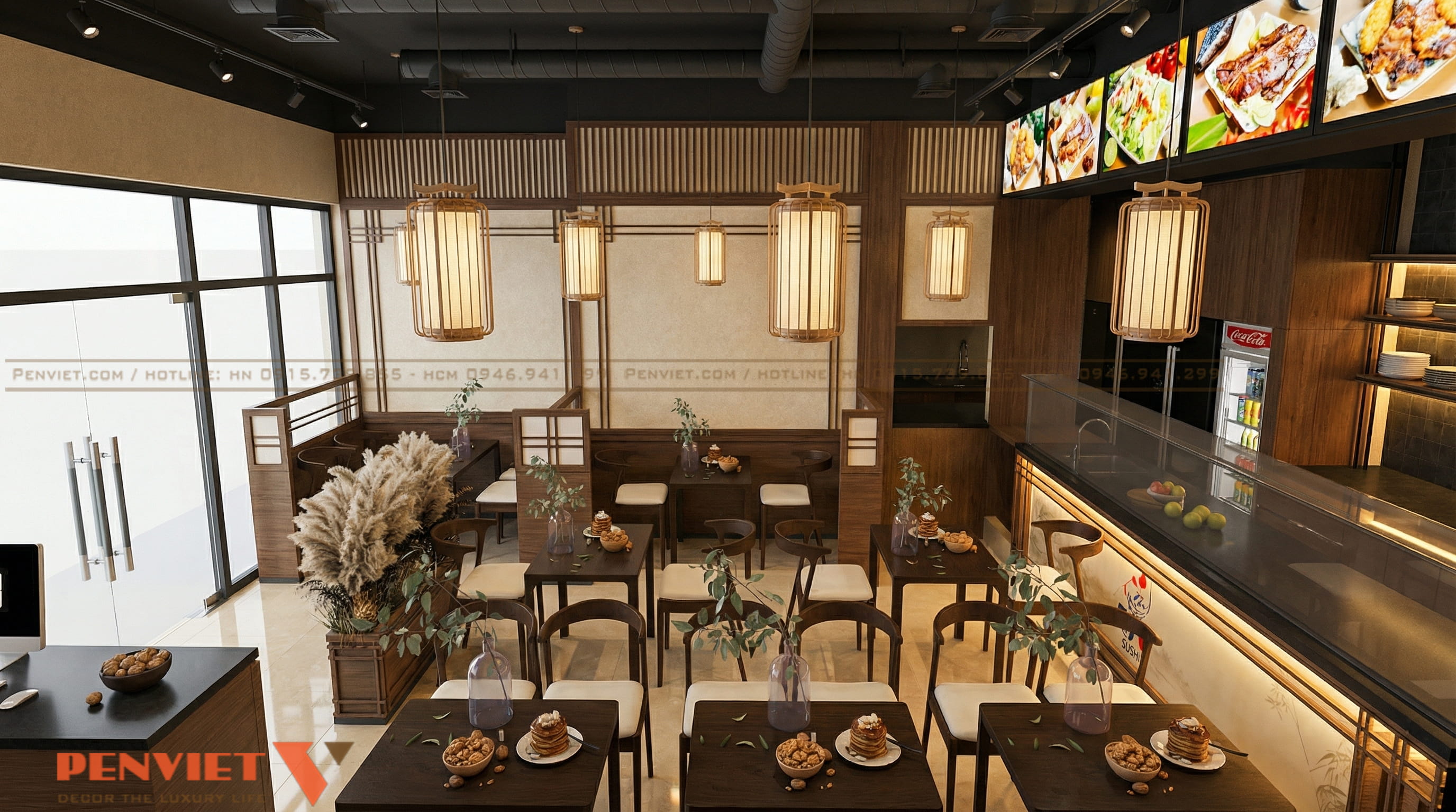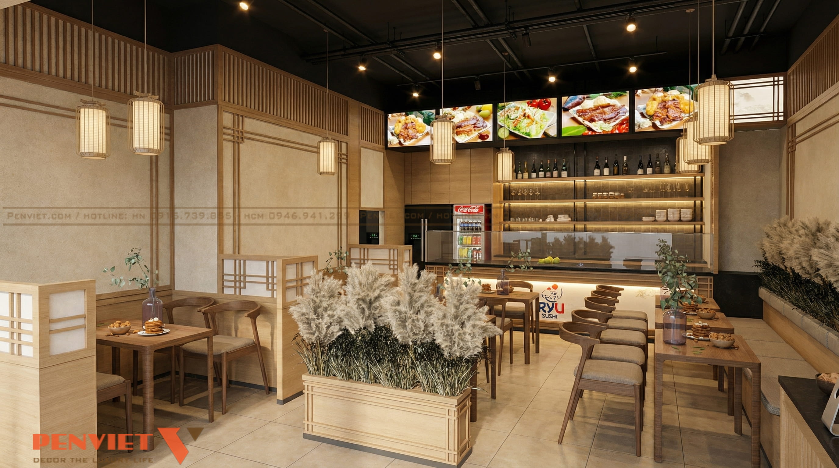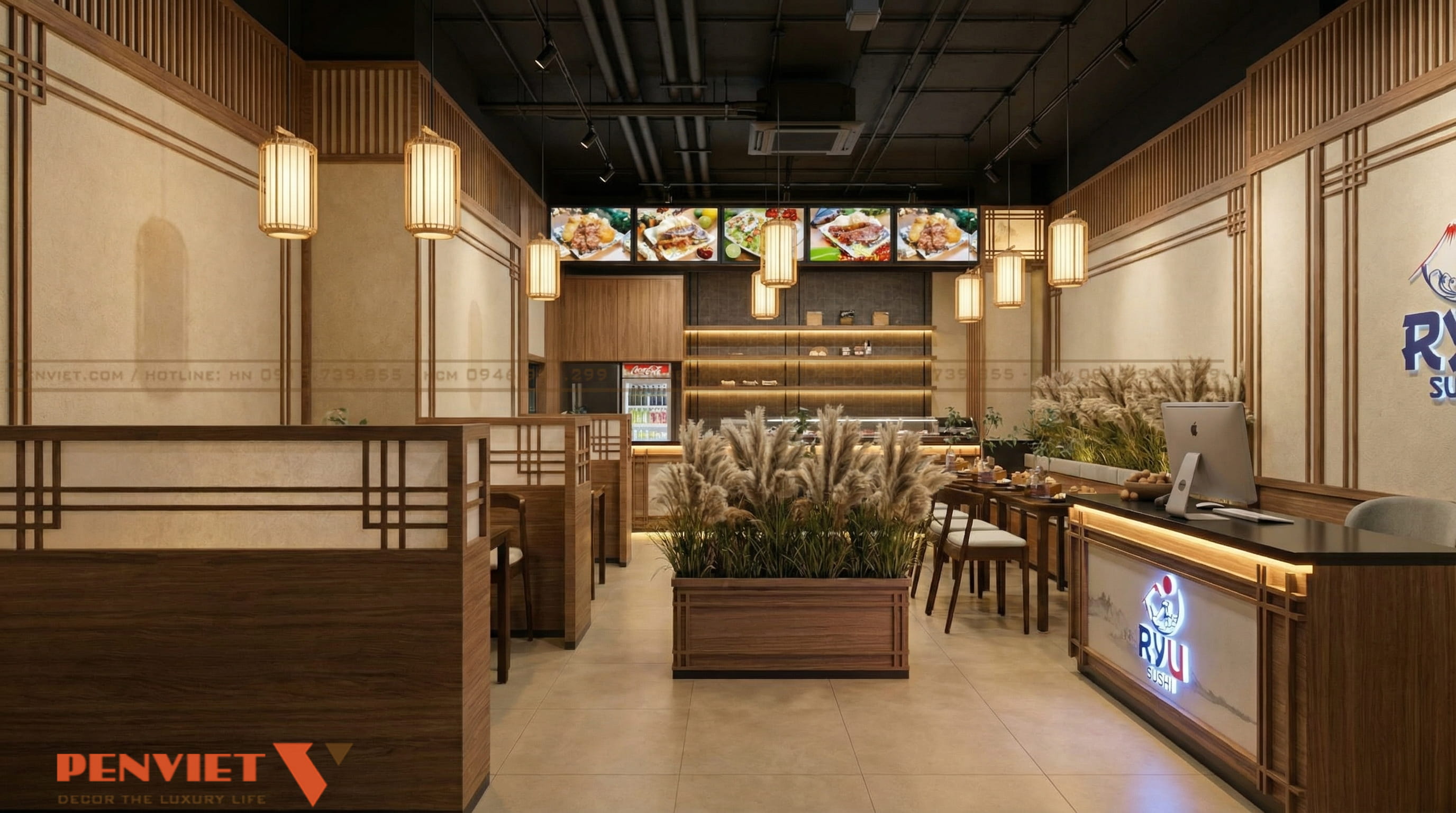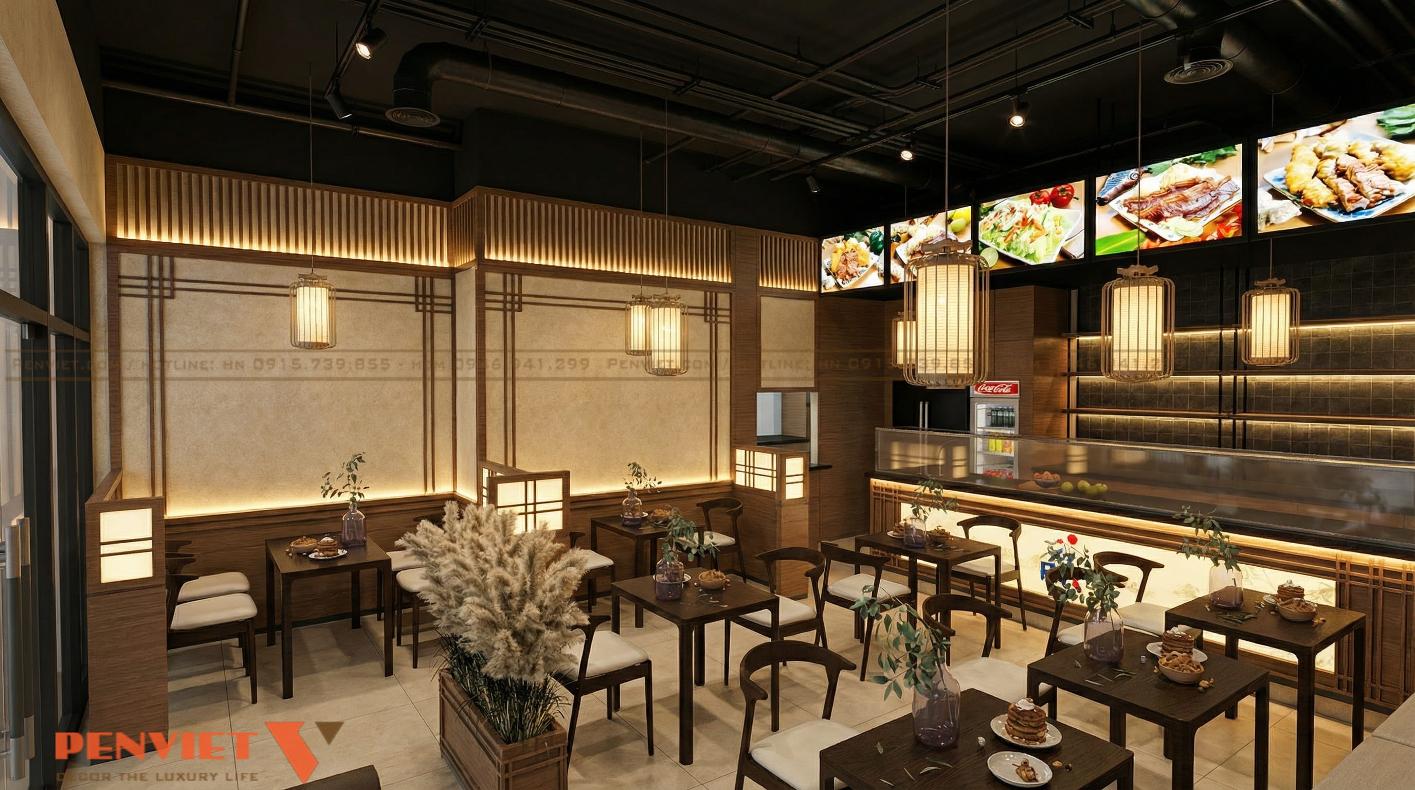 Đèn thả trần dạng lồng mang nét đặc trưng của phong cách Nhật. Ánh sáng vàng nhẹ giúp không gian ấm và dễ chịu. Đây là yếu tố quan trọng giữ chân khách hàng.