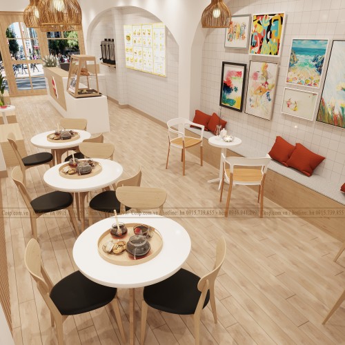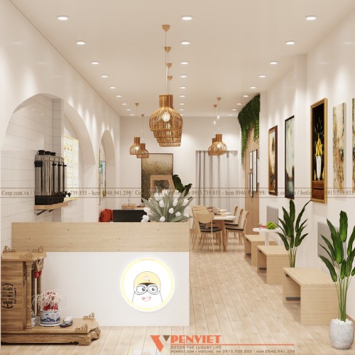 Ý tưởng : Sử dụng tông màu trắng là chủ đạo cùng hình dáng nội thất đơn giản, tinh tế nhưng không kém phần đẹp, bắt mắt. Các chi tiết trang trí mây tre mang cảm giác không gian ấm cúng và thân thuộc, lại rất đề cao tính dân tộc . Khiến cho khách hàng khi bước vào không gian nơi đây là cảm giác hài lòng, thu thái như ở căn nhà mình vậy.