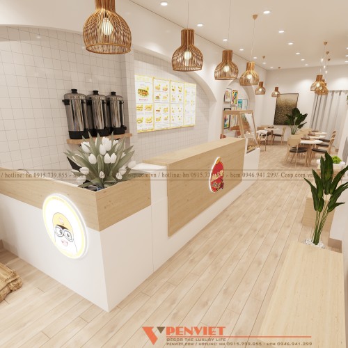 Penviet thiết kế khu vực quầy thanh toán bằng gỗ MDF An Cường. Phía sau tường là tấm menu cho khách hàng dễ dàng lựa chọn. Để tiện lợi hơn, chúng tôi thiết kế khay để bình nước làm từ Gỗ MDF phủ Melamine chống ẩm màu như hình 3D, chân đỡ khay bằng sắt, phụ kiện đi kèm.