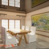 Phía đối diện với tranh geisha là một bức tường ốp gỗ, điểm xuyết bởi hai bức tranh tròn lấy cảm hứng từ tranh khắc gỗ Nhật Bản nổi tiếng. Đặc biệt là hình ảnh sóng thần Kanagawa cùng với hoa anh đào bay theo chiều gió. Bức tranh tròn được lồng khung gỗ đứng, tạo nên điểm nhấn đối xứng hài hòa cho toàn bộ căn phòng. Không gian tường này còn được lắp thêm hệ thống đèn rọi trần, cho phép ánh sáng chiếu vào từng bức tranh, giúp chúng nổi bật mà không gây chói mắt.