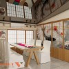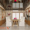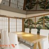 Một trong những yếu tố khiến các phòng VIP tại nhà hàng này trở nên đặc biệt chính là hệ vách ngăn và tường trang trí bằng tranh Nhật. Mỗi căn phòng sở hữu bức vách là bức tranh khổ lớn được chia thành nhiều ô vuông với hình ảnh khác nhau. Ví dụ trên nền tranh là hình ảnh nữ geisha trong trang phục kimono truyền thống, được vẽ tỉ mỉ với những đường nét mềm mại, sắc màu trang nhã. Xung quanh là họa tiết hoa anh đào và sóng nước – biểu tượng của vẻ đẹp và sự chuyển động nhẹ nhàng trong văn hóa Nhật.