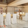 Toàn bộ không gian phòng ăn VIP được thiết kế xoay quanh hai chất liệu chính là gỗ và vải trắng. Gỗ được sử dụng cho tường, vách, bàn và khung tranh có màu nâu nhạt, gần với màu gỗ sồi, tạo cảm giác mộc mạc, gần gũi. Trong khi đó, vải trắng được chọn cho ghế mang lại sự thanh khiết, tạo điểm cân bằng cho sắc gỗ trầm ấm.