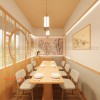 Một trong những phòng nổi bật của thiết kế nhà hàng sushi Kuan là phòng ăn với kiểu ngồi bệt truyền thống Nhật Bản, tạo cảm giác gần gũi và thân thiện cho thực khách. Phòng này sử dụng bàn gỗ dài cùng các tấm đệm ngồi màu trung tính, giúp thực khách có thể ngồi thoải mái trong suốt bữa ăn. Các bức tranh treo tường phong cách Nhật Bản, như bức tranh sóng nổi tiếng Hokusai, cùng với các câu đối chữ Hán, làm tăng thêm cảm giác văn hóa và nghệ thuật Nhật trong không gian này.