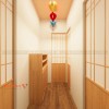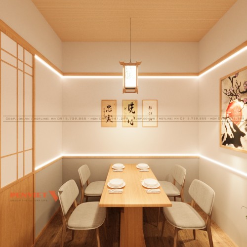 Phòng sử dụng bảng màu trung tính, chủ yếu là màu gỗ sáng và trắng, kết hợp với các bức tranh thủy mặc và các chậu cây bonsai nhỏ đặt trong góc phòng. Không gian yên tĩnh, thanh bình này giúp thực khách cảm nhận được sự tĩnh lặng và thư giãn, phù hợp cho những bữa ăn thân mật.