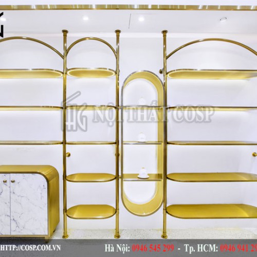 Một số chiếc kệ có kiểu dáng cong vòm rất bắt mắt, trở thành điểm nhấn cho quán.