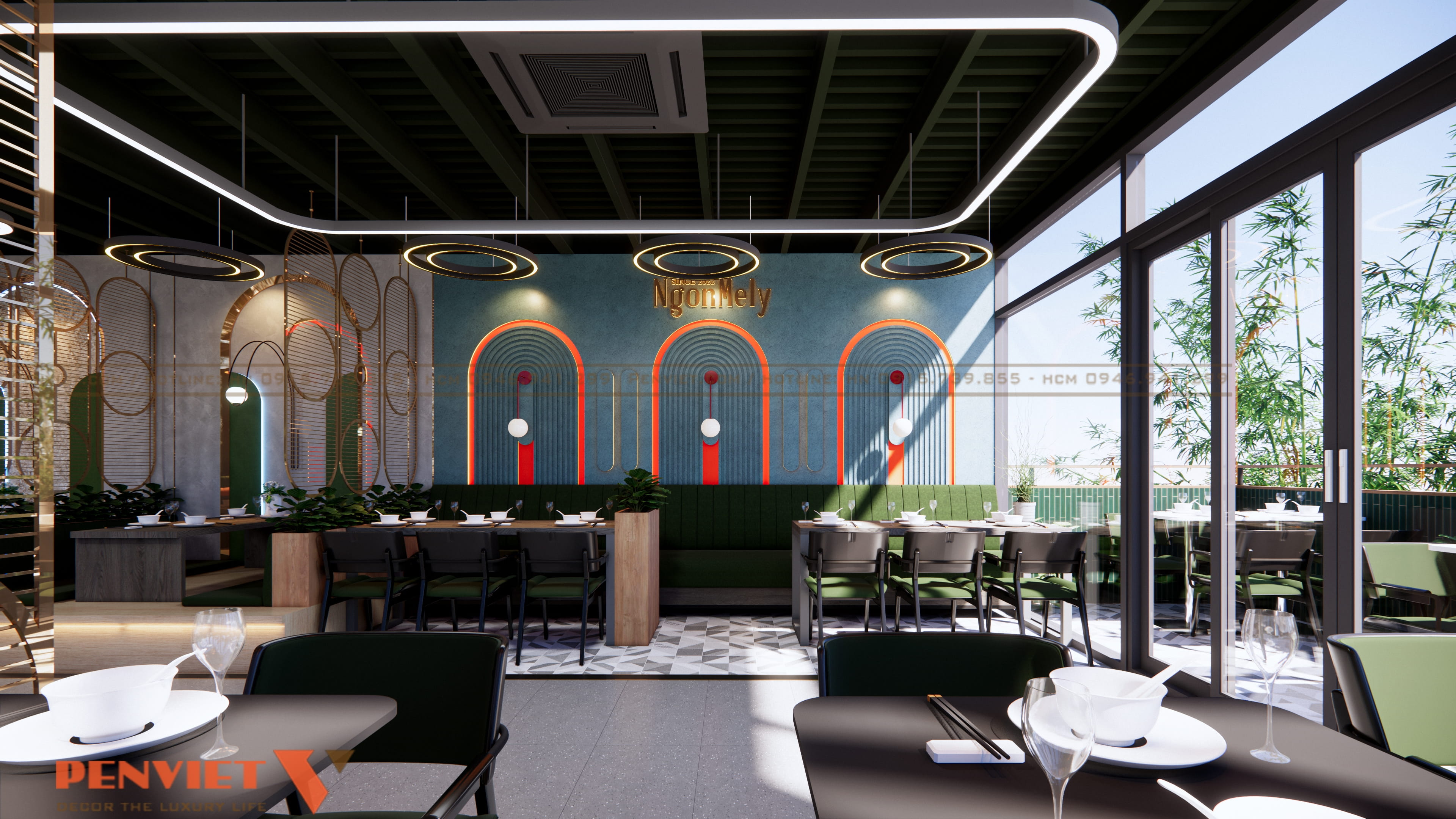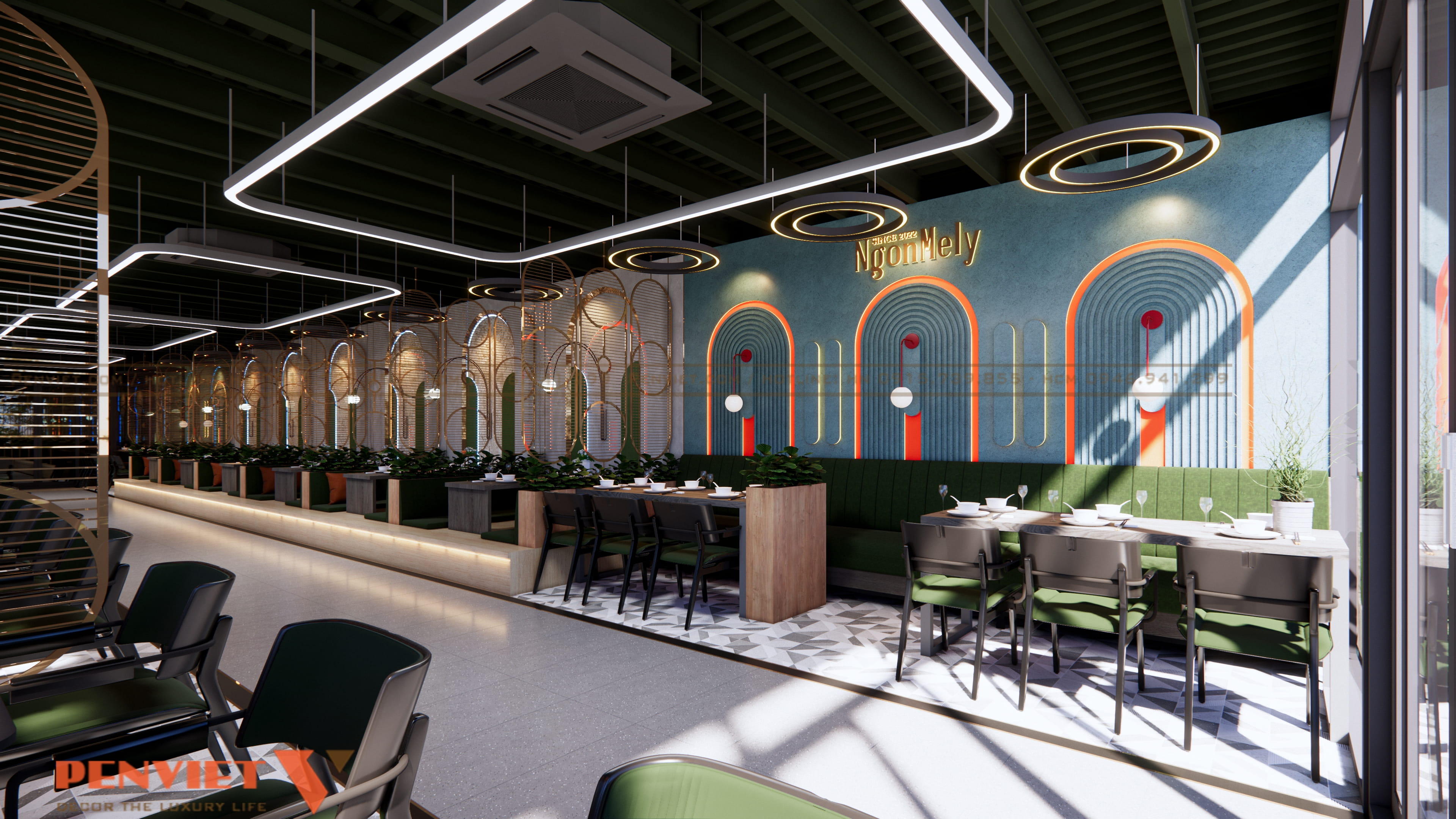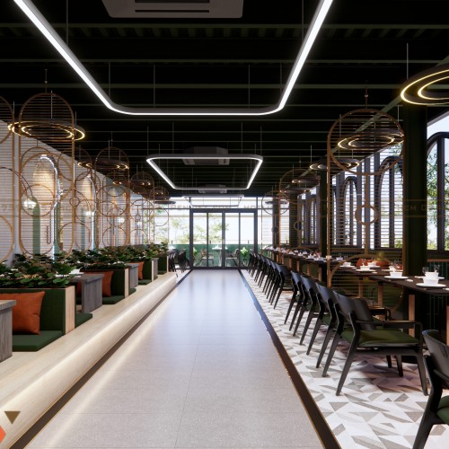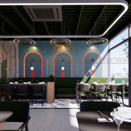 Tông màu xanh làm chủ đạo vừa tạo sự mát mắt, vừa tạo nét khác biệt trong thị trường quán ăn cạnh tranh cao. Kết hợp cùng hệ thống đèn LED vàng giúp không gian có chiều sâu và tạo cảm giác ấm cúng.