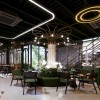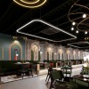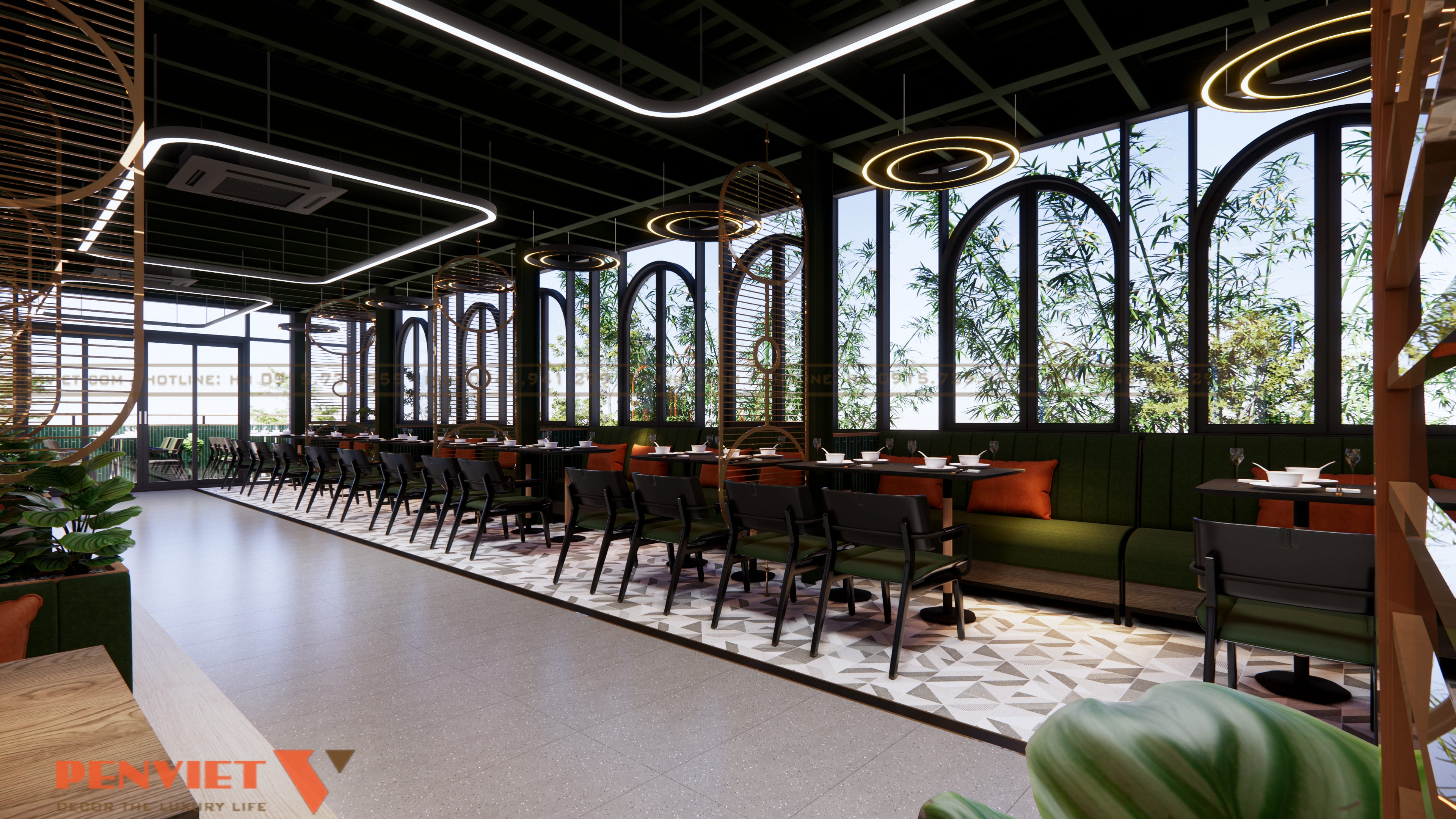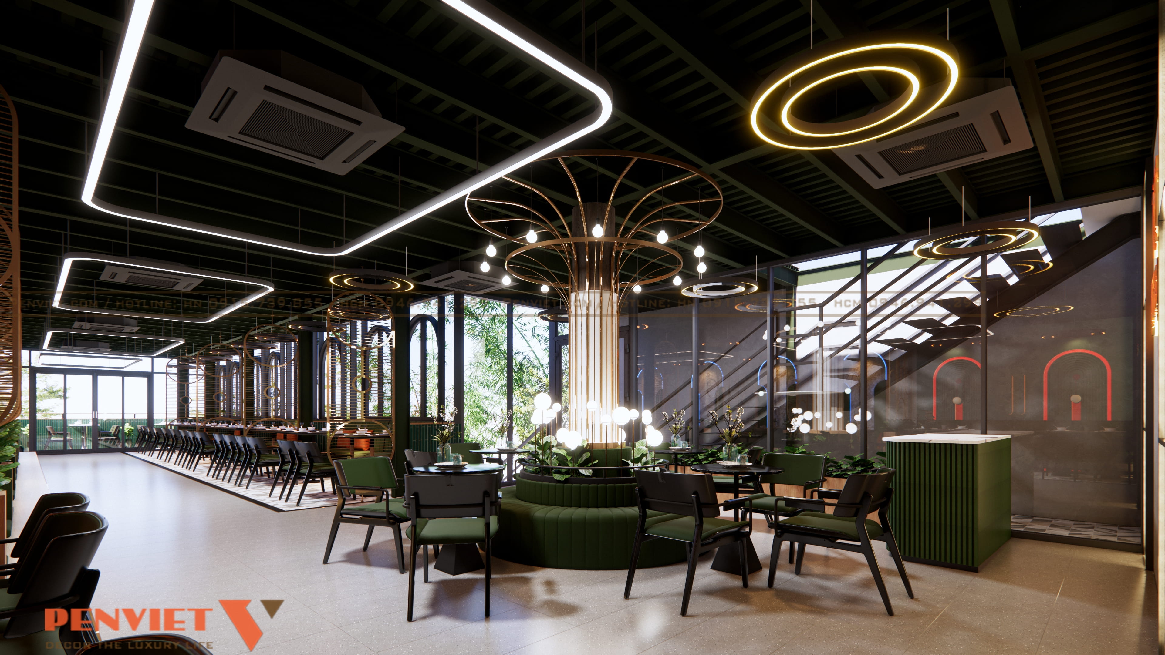 Hệ thống đèn vòng tròn treo thả trần giúp không gian trở nên sang trọng và mới mẻ. Ánh sáng mềm, trải đều tạo nên cảm giác dễ chịu cho khách. Ngoài ra, ánh sáng từ cửa kính lớn tận dụng được nguồn sáng tự nhiên, giúp quán luôn thông thoáng và tiết kiệm năng lượng.