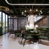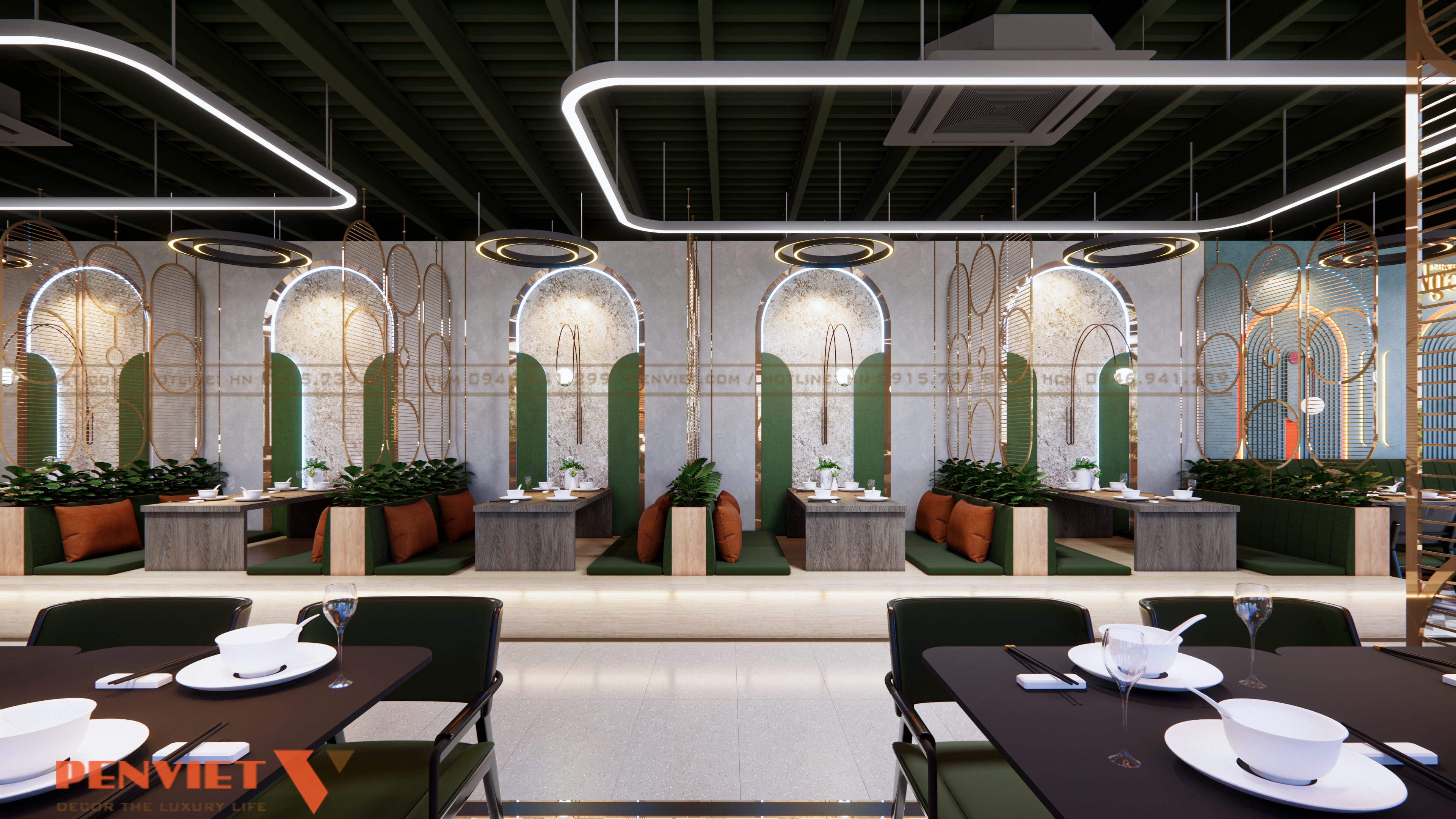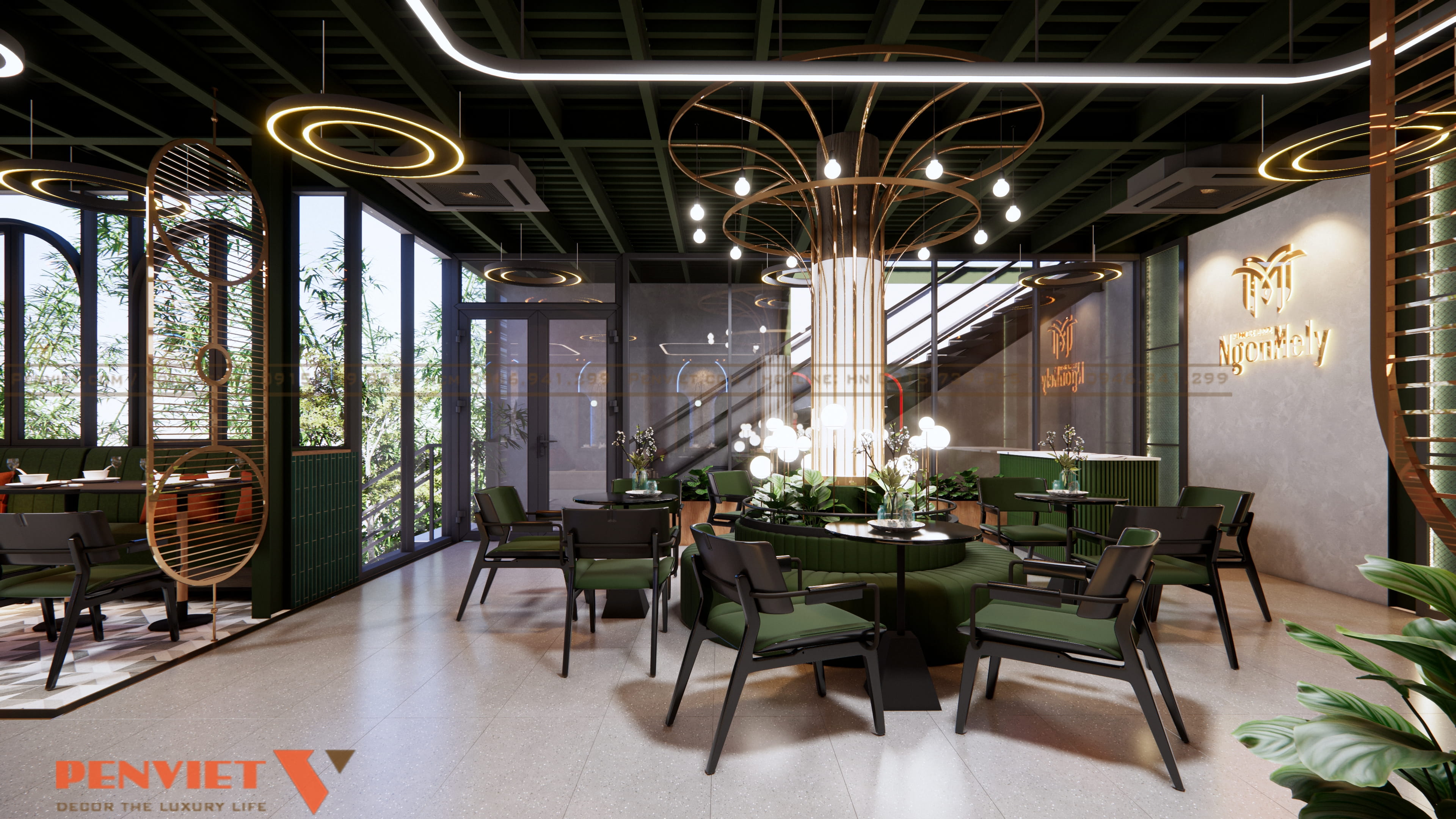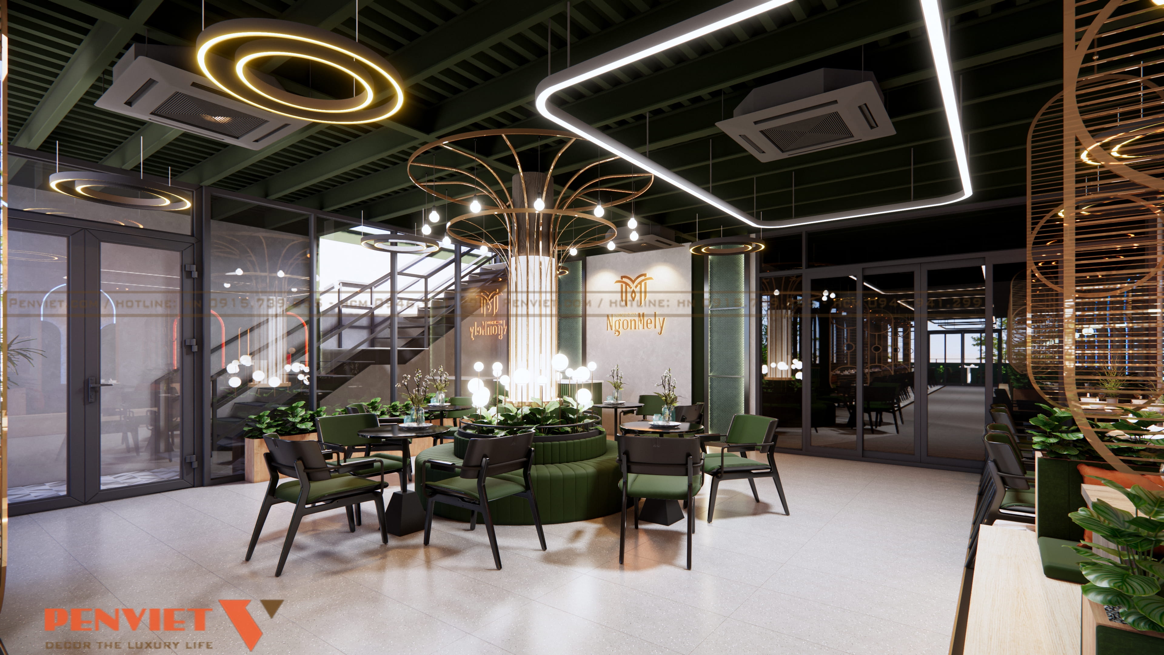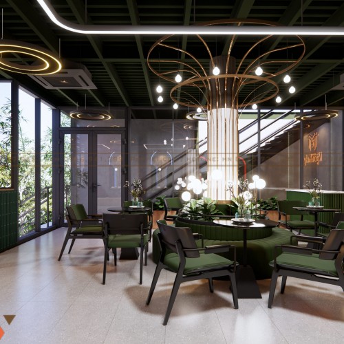 Điểm mạnh của thiết kế là sự kết hợp hài hòa giữa màu xanh rêu, ánh sáng vàng ấm và các chi tiết kim loại ánh đồng, tạo nên sự cuốn hút ngay từ khi khách bước vào.