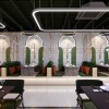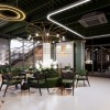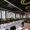 Trần được thiết kế dạng mở với các thanh lam sơn xanh đậm, vừa che đi các chi tiết kỹ thuật, vừa mang đến phong cách công nghiệp hiện đại. Nhờ vậy, không gian cao thoáng và không gây cảm giác nặng nề. Thiết kế trần mở cũng phù hợp với các hệ thống đèn treo, giúp đồng bộ hóa toàn bộ khu vực.