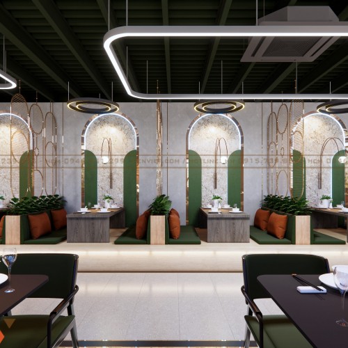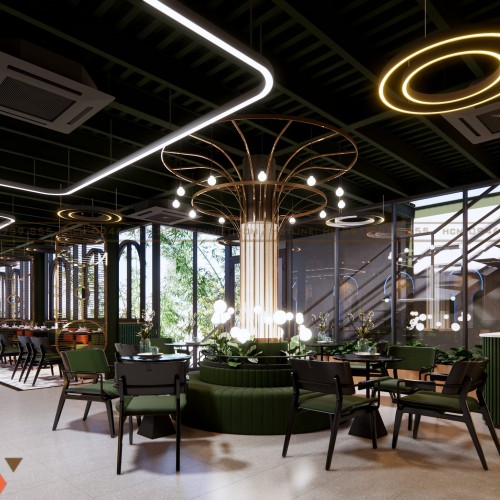 Một trong những điểm nhấn mạnh nhất của dự án là tiểu cảnh ở trung tâm quán, kết hợp ánh sáng nghệ thuật và cây xanh. Hệ cột trang trí mô phỏng hình dáng của bông hoa, tạo cảm giác mềm mại và sang trọng. Khu vực này không chỉ thu hút ánh nhìn mà còn giúp phân chia các khu bàn ăn một cách tinh tế.