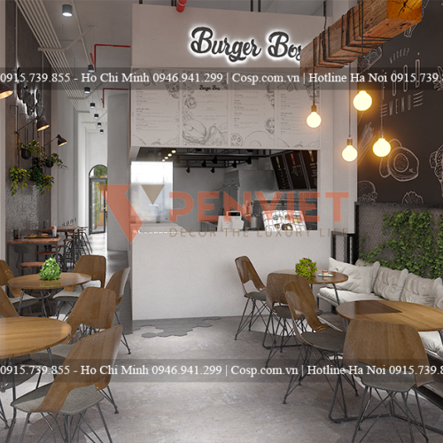 Thiết kế cửa hàng ăn nhanh rất hài hòa và hợp lý. Phía trước mặt quầy thu ngân là không gian chính cho khách hàn ngồi thưởng thức những món ăn ngon, đồ uống tuyệt vời của quán. Nội thất khu vực này được thiết kế đơn giản để tiết kiệm diện tích, bàn tròn được thiết kế tạo điểm nhấn nhẹ nhàng. Tranh treo tường lôi cuốn thu hút ánh nhìn của khách hàng.