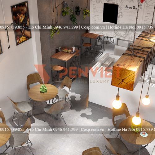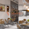 Phần phía bên cạnh quầy thu ngân được những kiến trúc sư Nội thất Cosp tận dụng triệt để khi thiết kế 2 chiếc bàn vuông ở đây. Không gian tận dụng này tuy bé nhưng không thể thiếu thẩm mỹ được. Chúng tôi trang trí quán ăn nhiều cây xanh ở phía trên tường, những chậu cây được treo lơ lừng phần nào làm cho khu vực này thêm sinh động hơn.