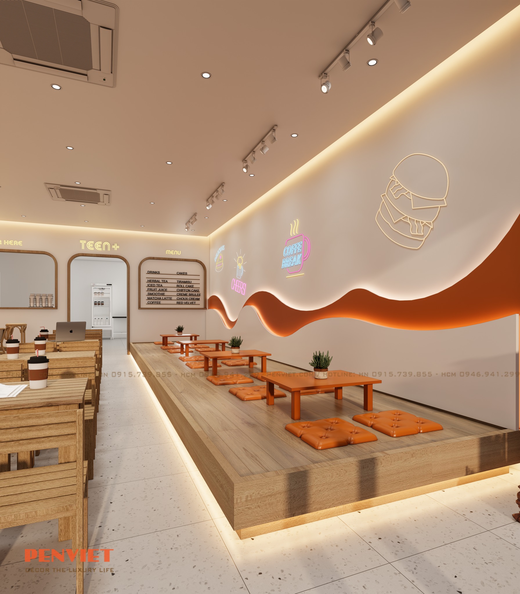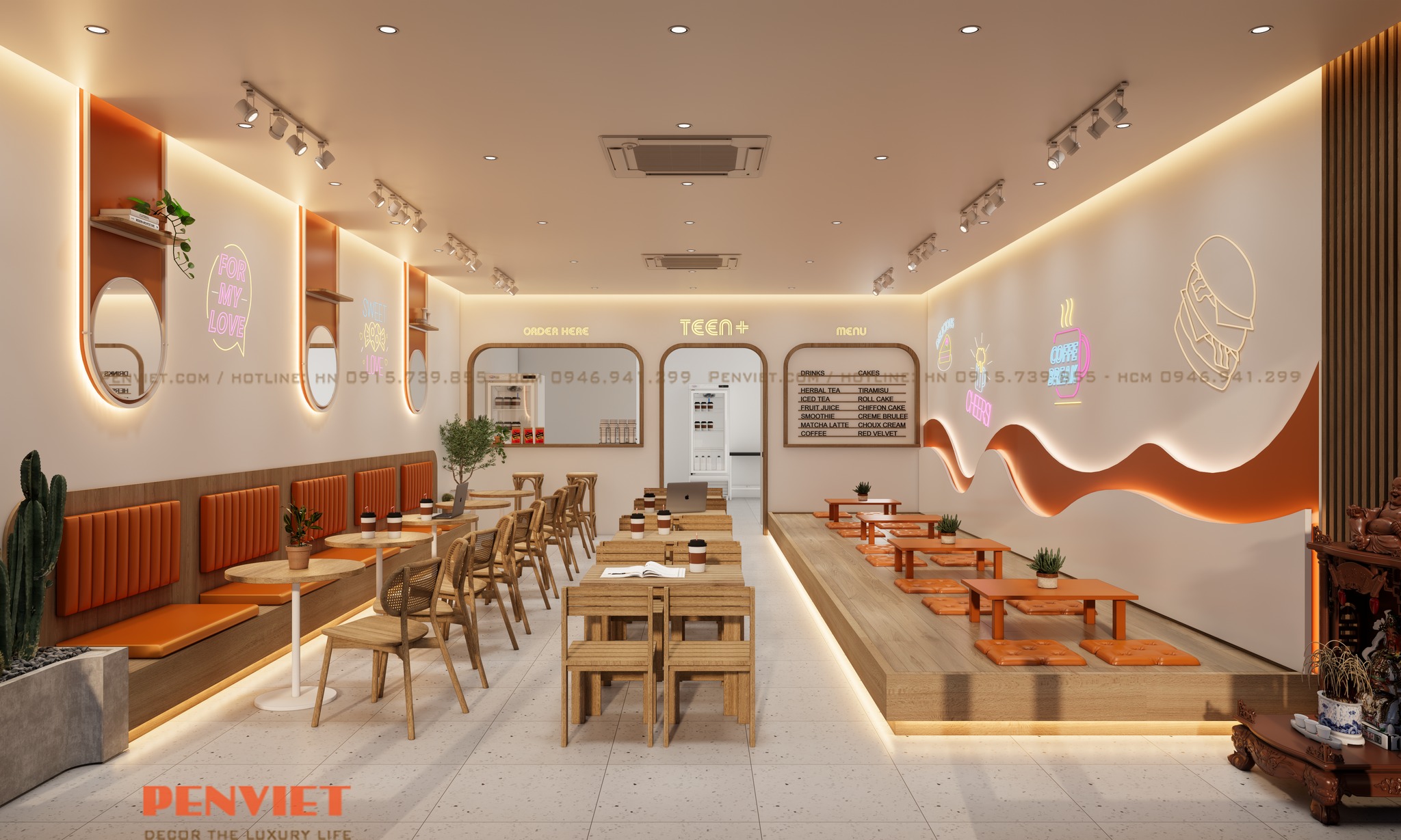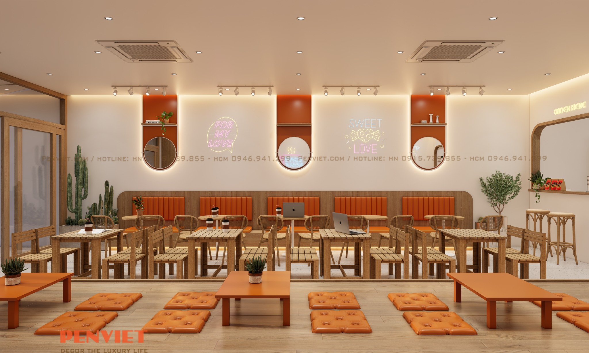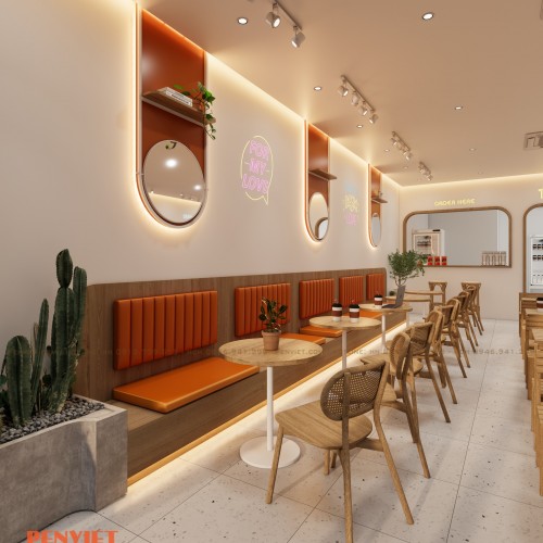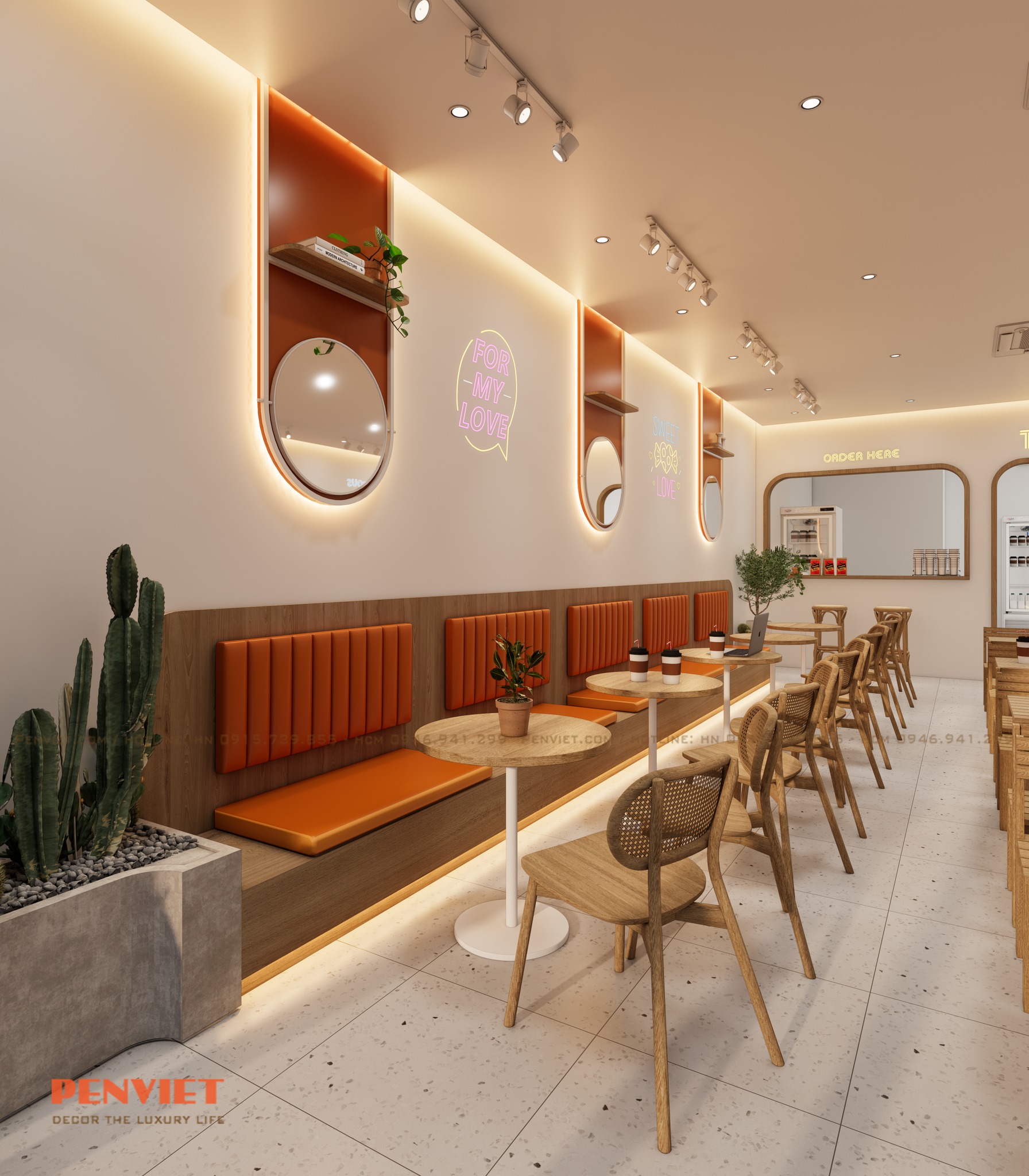 Tông màu cam đất kết hợp trắng kem mang lại cảm giác ấm áp và trẻ trung. Hệ đèn led hắt tường chạy dài tạo chiều sâu cho không gian. Các chi tiết bo cong mềm mại giúp quán trở nên thân thiện hơn với khách hàng trẻ.