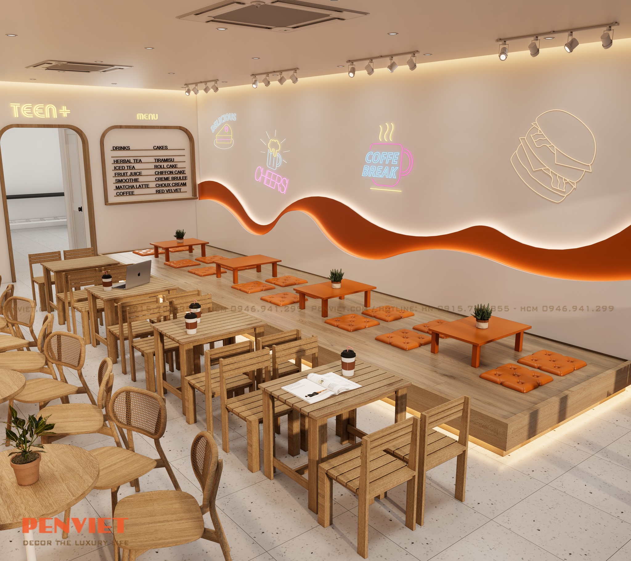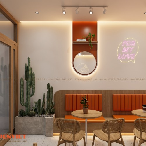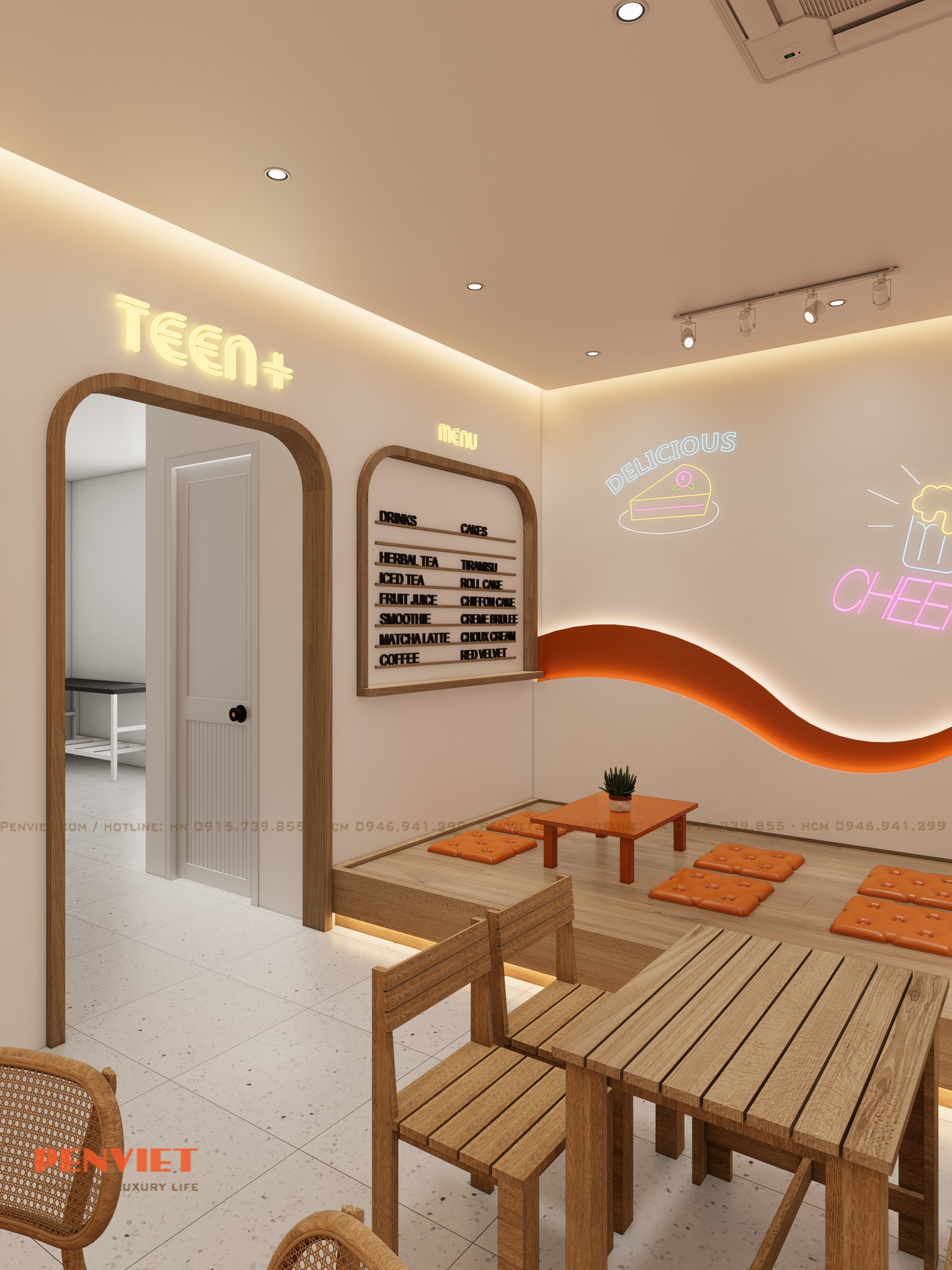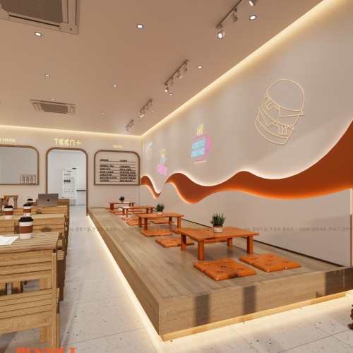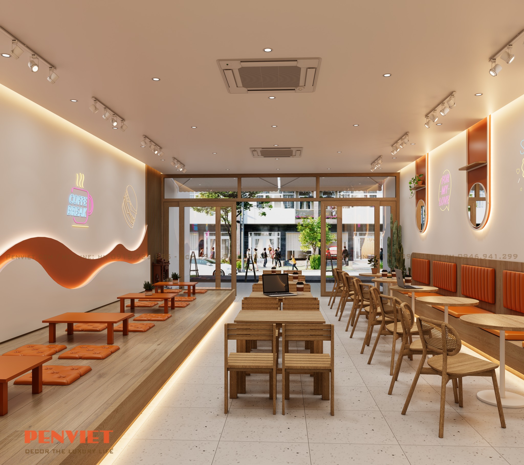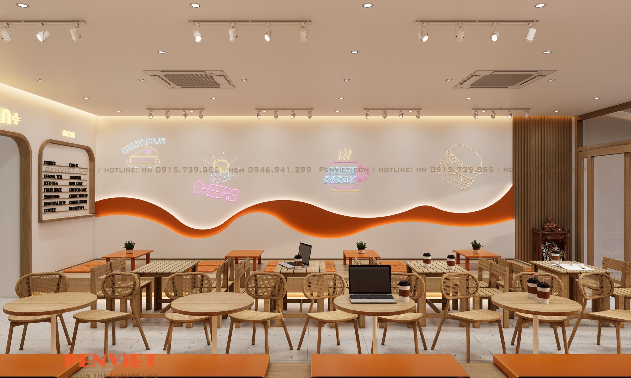 Tông màu cam đất kết hợp trắng kem mang lại cảm giác ấm áp và trẻ trung. Hệ đèn led hắt tường chạy dài tạo chiều sâu cho không gian. Các chi tiết bo cong mềm mại giúp quán trở nên thân thiện hơn với khách hàng trẻ.