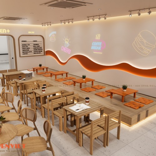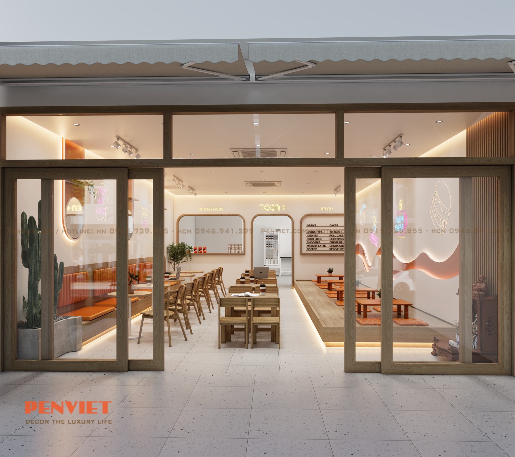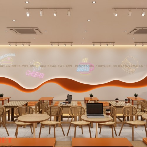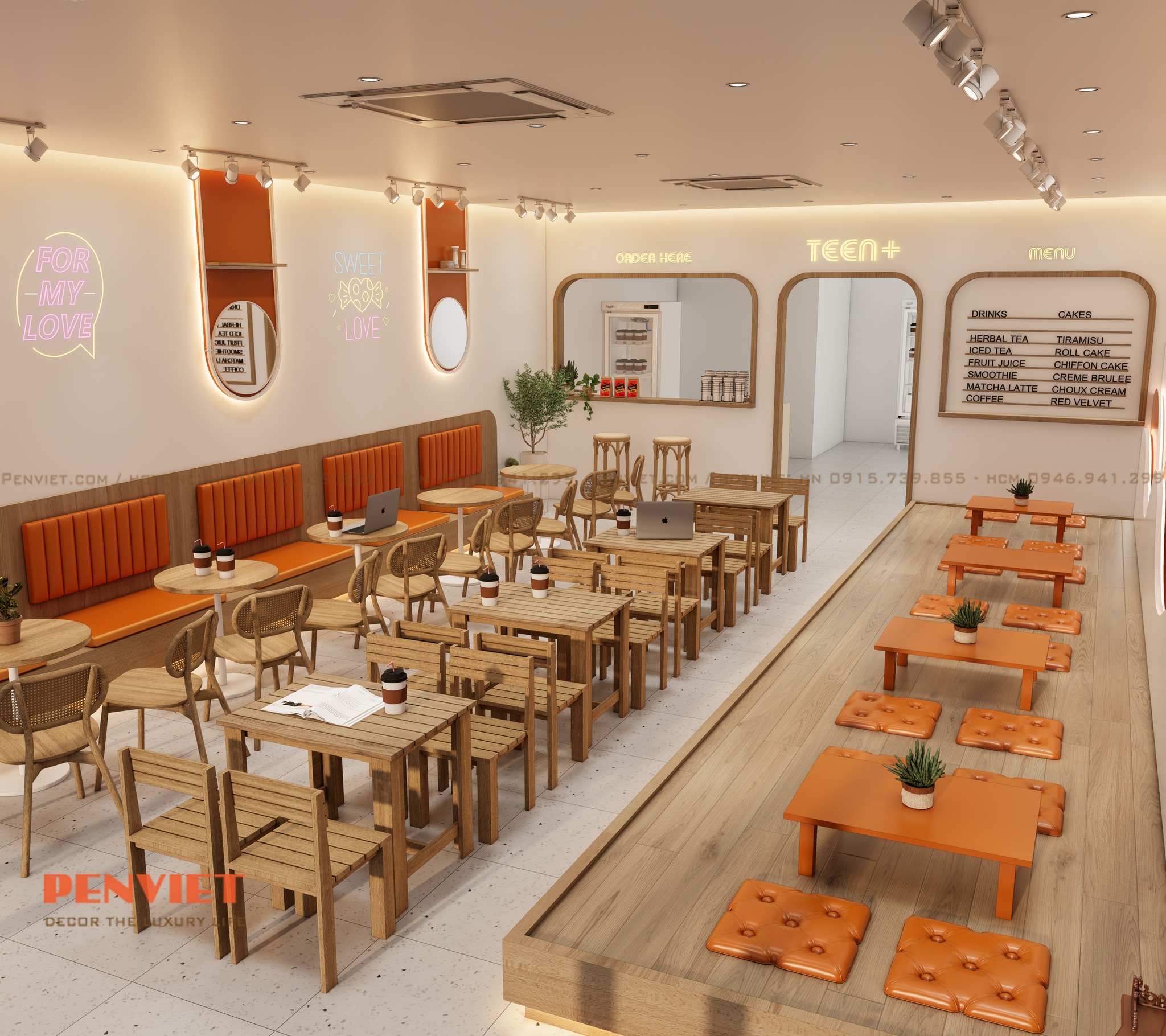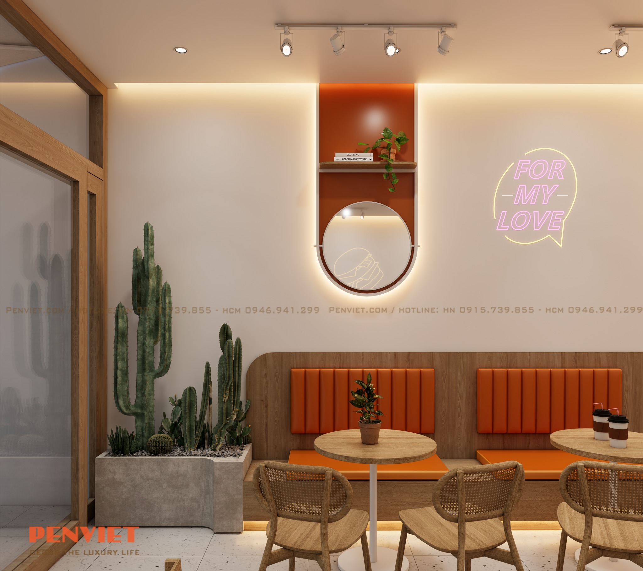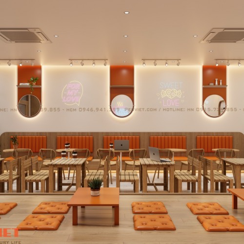 Tông màu cam đất kết hợp trắng kem mang lại cảm giác ấm áp và trẻ trung. Hệ đèn led hắt tường chạy dài tạo chiều sâu cho không gian. Các chi tiết bo cong mềm mại giúp quán trở nên thân thiện hơn với khách hàng trẻ.