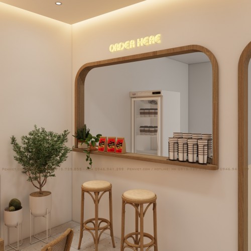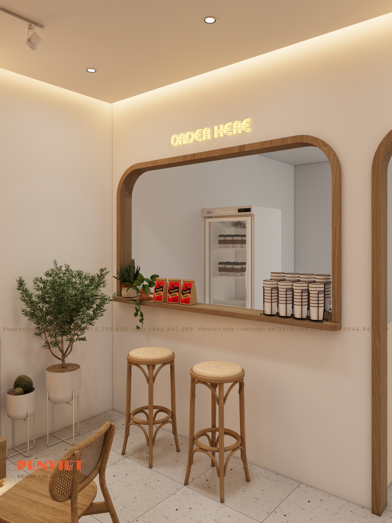 Quầy order được đặt ở trung tâm cuối nhà, giúp kiểm soát dòng khách tốt hơn. Menu treo tường rõ ràng, dễ quan sát khi bước vào. Khu chế biến được bố trí gọn phía sau, đảm bảo vệ sinh và tách biệt.